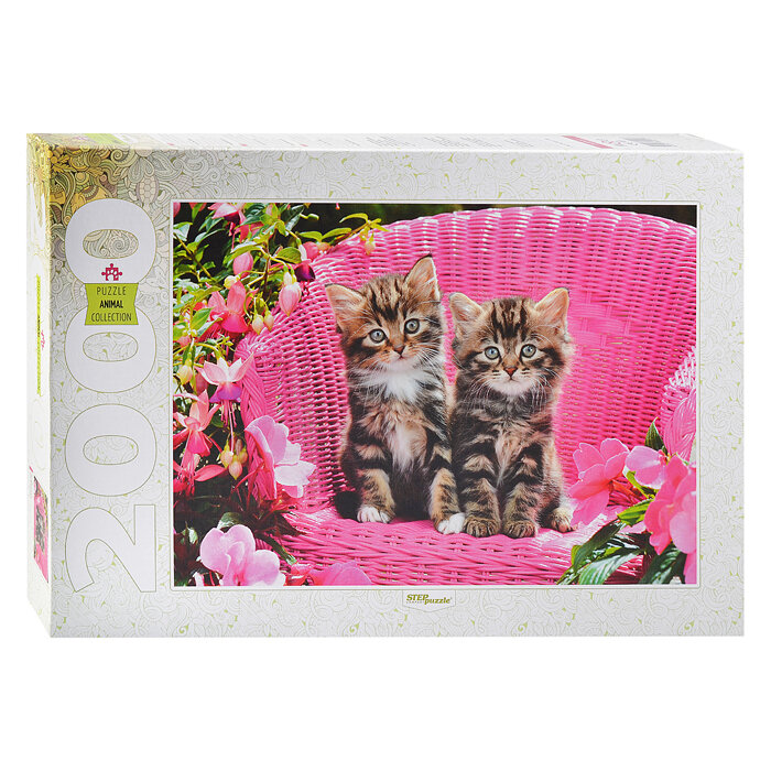 Пазл "Милые котята" состоит из 2000 деталей и входит в серию "Animal collection". С картинки на нас смотрят два пушистых малыша, которые сидят на плетёном розовом кресле.
