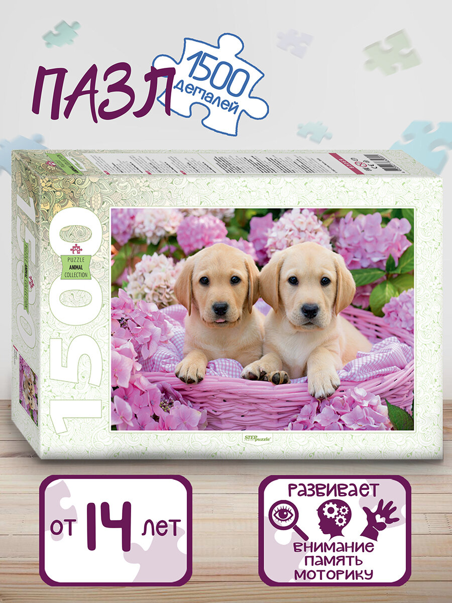 Пазл "Щенята" состоит из 1500 деталей и входит в серию "Animal collection". На его картинке мы видим двух милых щенков в окружении нежных розовых цветов.