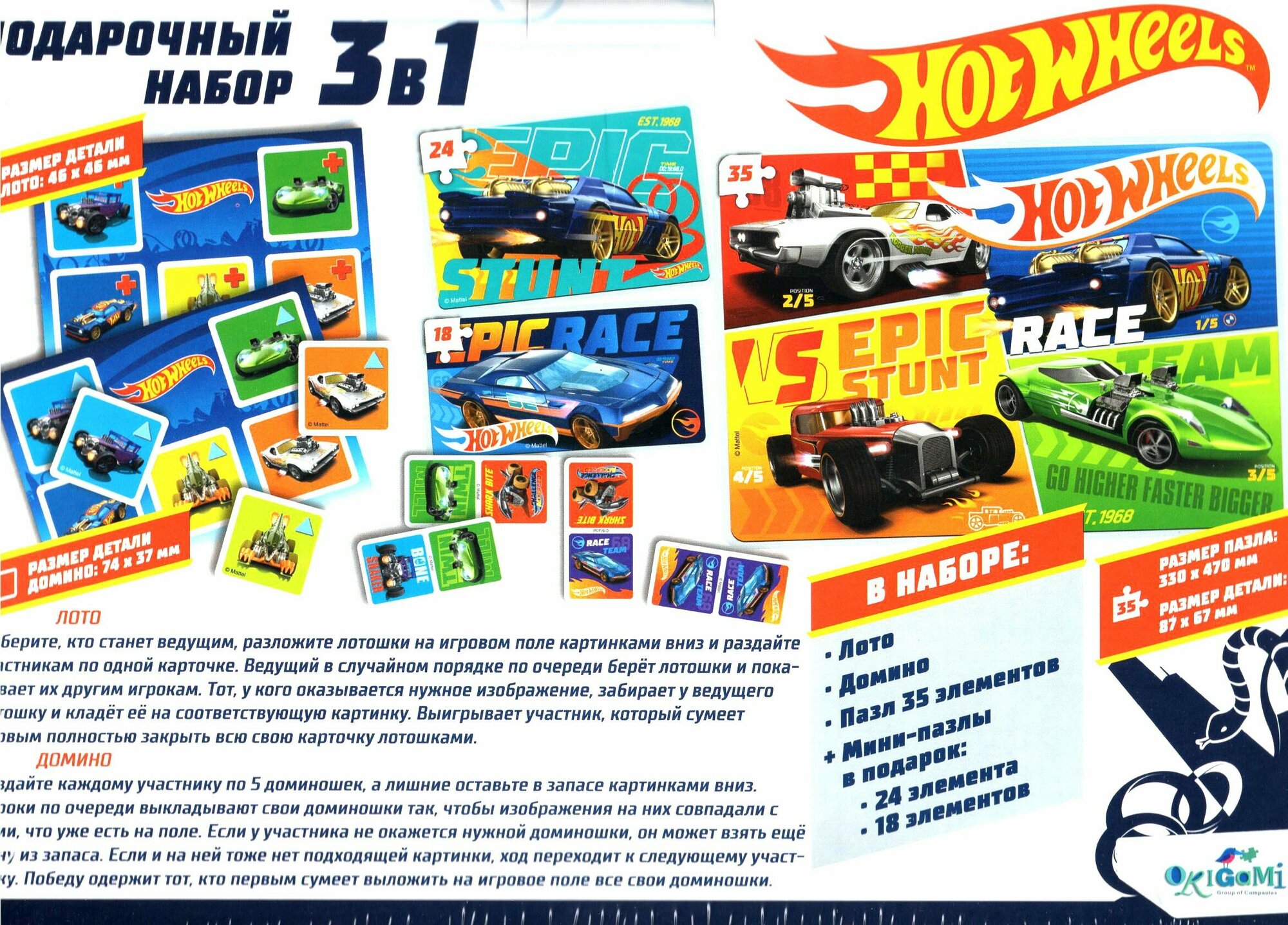 Подарочный набор 3 в 1 "Hot Wheels" - это уникальный набор, включающий в себя яркие пазлы с разной элементностью, а также ряд развивающих настольных игр, благодаря которым ребёнок узнает, что такое лото и домино, и потренирует внимательность. Такой набор - самый лучший способ увлечь ребёнка и познакомить его в игровой форме с новыми знаниями, навыками и умениями.