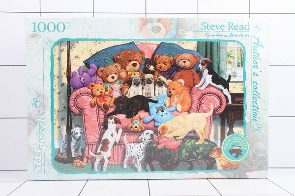 Пазл "Бабушкино кресло" относится к авторской коллекции. Картина принадлежит кисти Стива Рида, в большом уютном кресле мы тут видим гору игрушек, а рядом играют любимые питомцы.