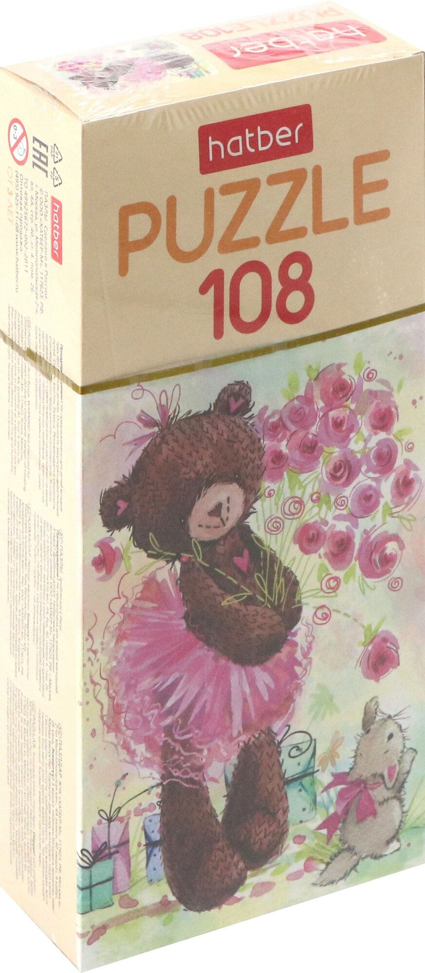 Пазл состоит из 108 элементов, дополнительно упакованных в прозрачный пакетик.