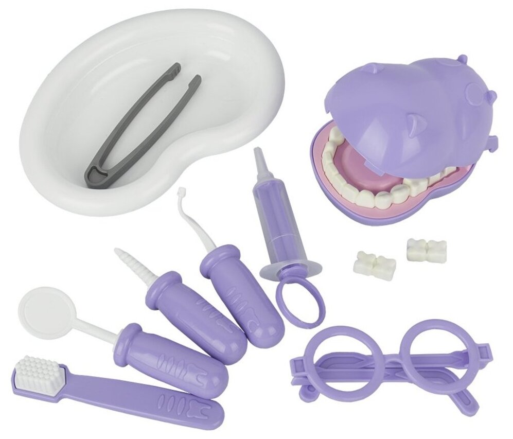 Комплектация набора : бегемот, ванночка, пинцет, сверло, крючок, зеркало, шприц, очки, зубная щетка.