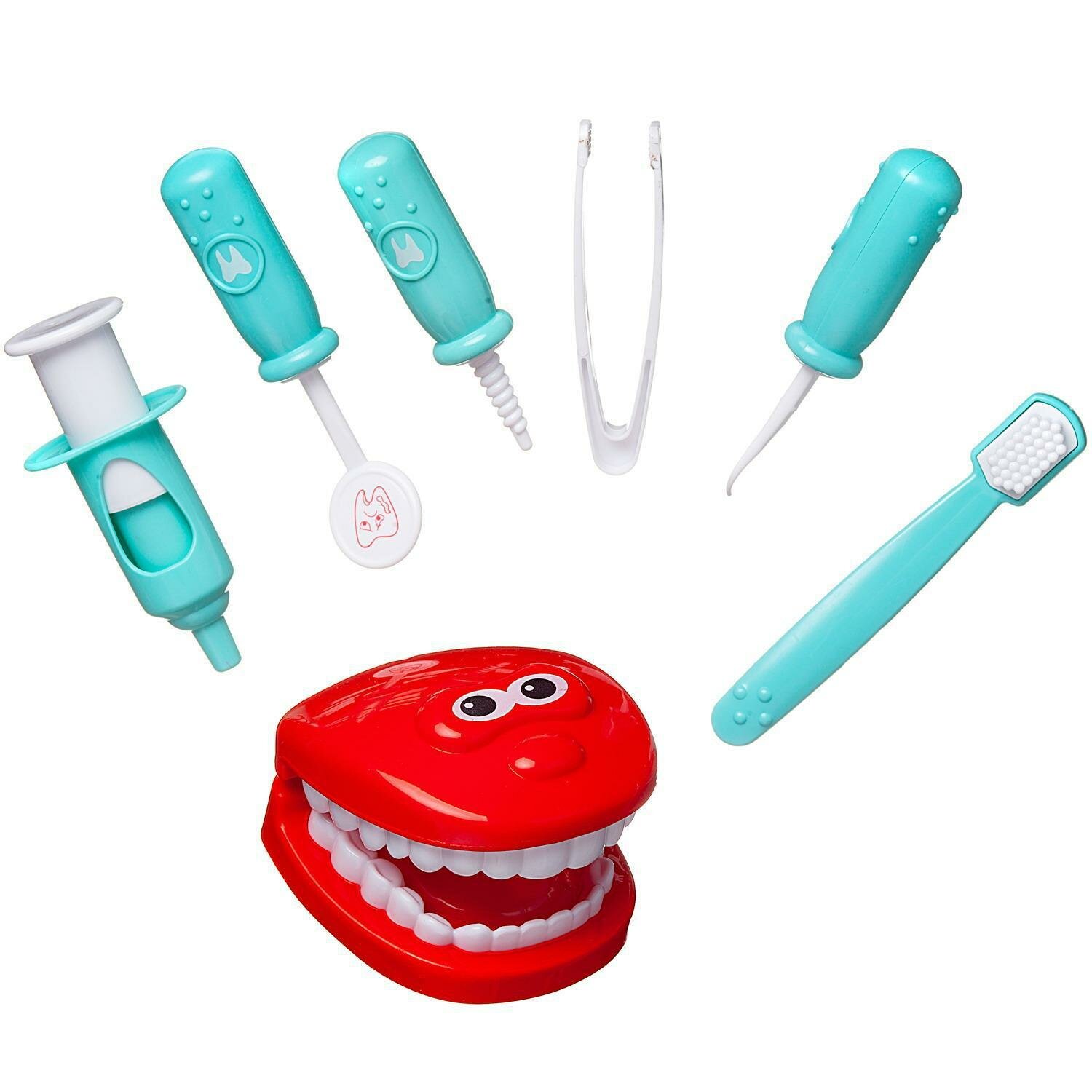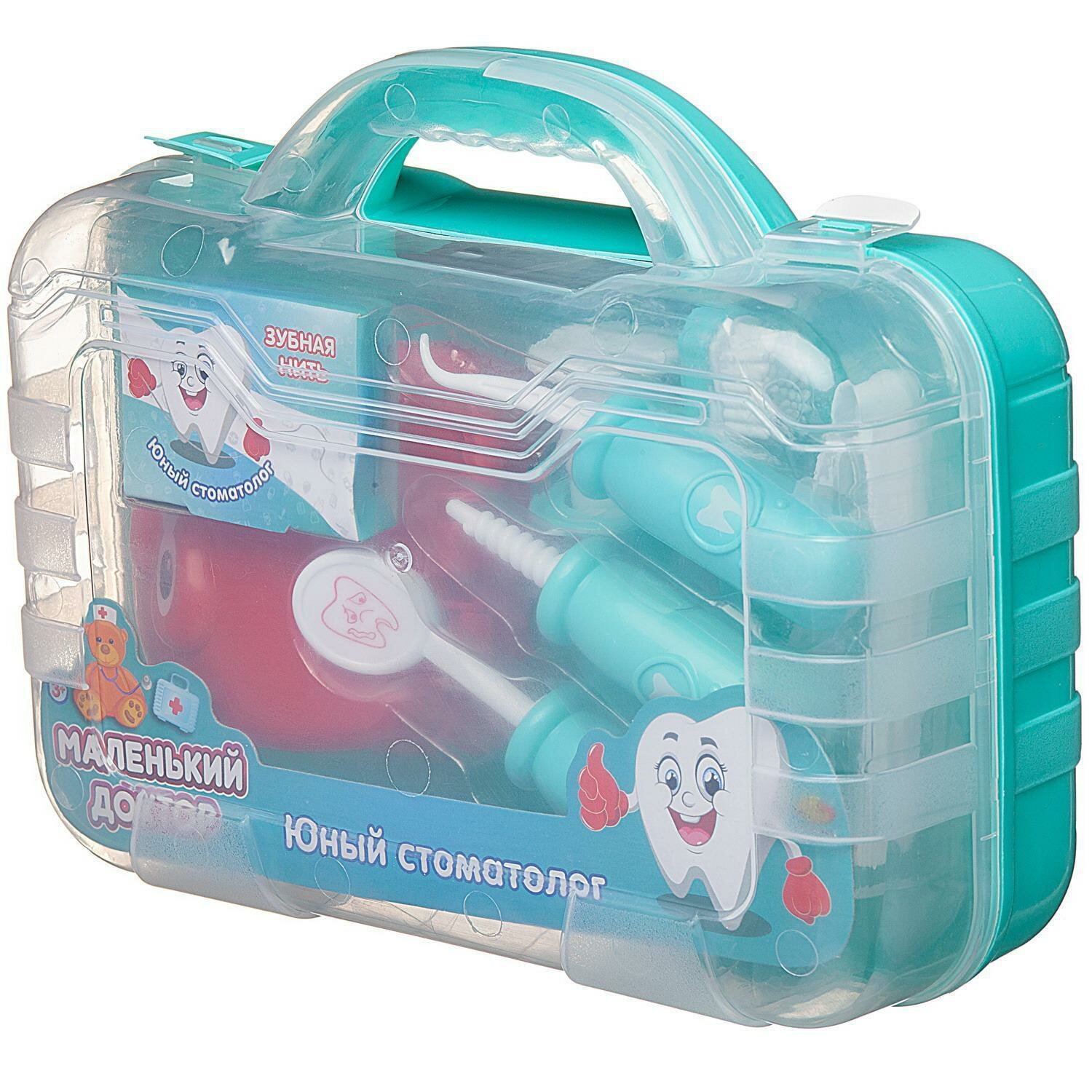 Комплектность: чемодан - 1 шт., подвижный макет челюсти - 1 шт., стоматологический инструмент - 3 шт., шприц - 1 шт., зубная щетка - 1 шт., пинцет - 1 шт., зубная нить (муляж) - 1 шт.