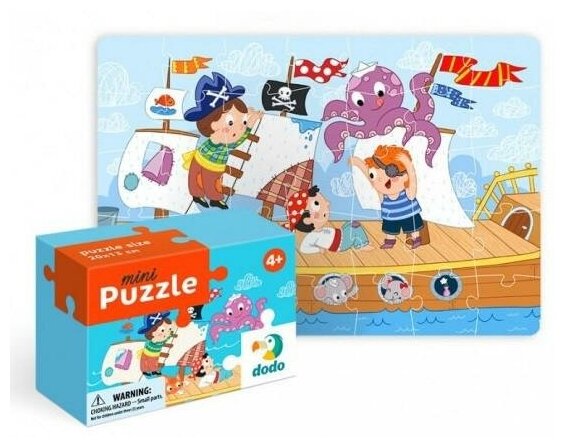 Пазл-мини "Морские приключения" представляет собой изображение веселой команды пиратов. Чтобы получить яркую картинку, ребенку необходимо соединить 35 элементов.
