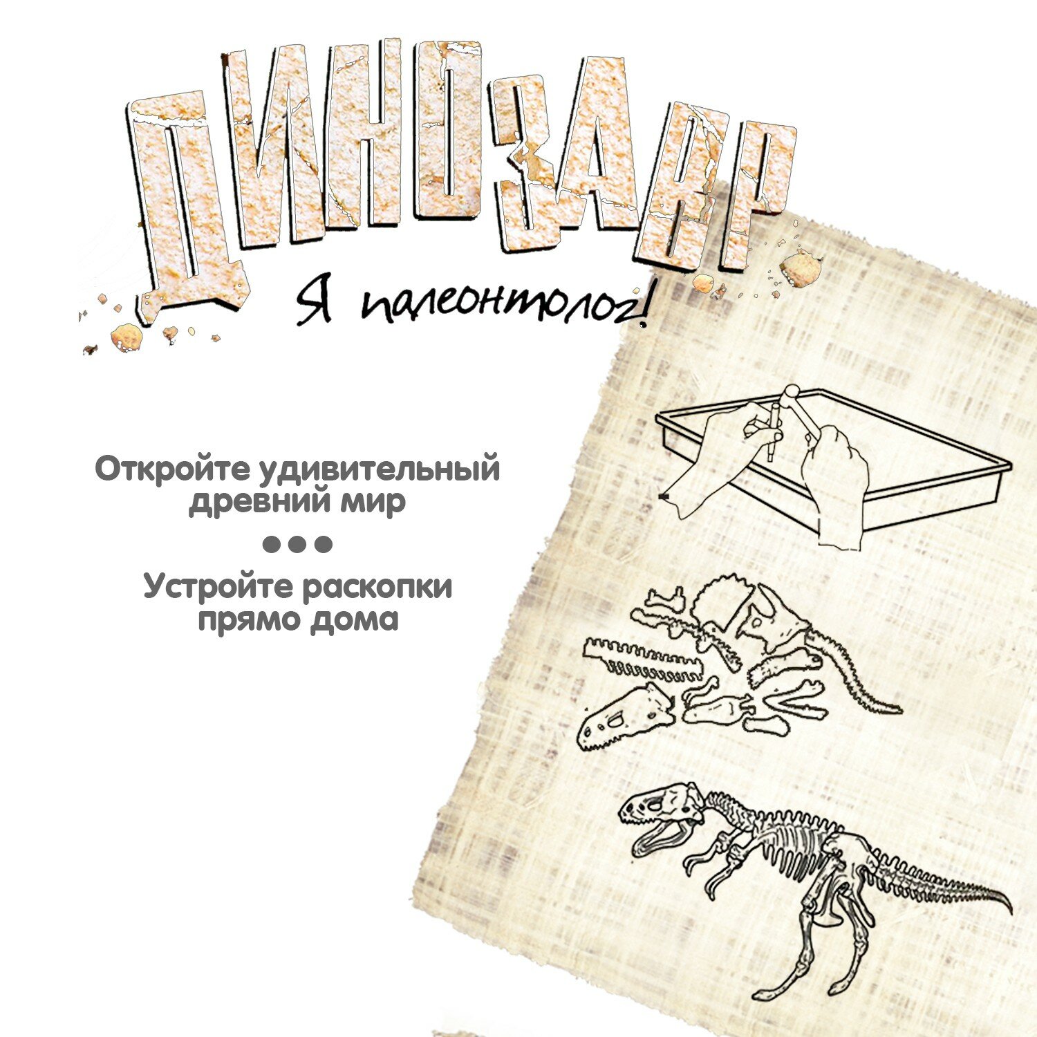 В комплекте: блок для раскопок, молоток, зубило, кисточка, губка, скелет динозавра.