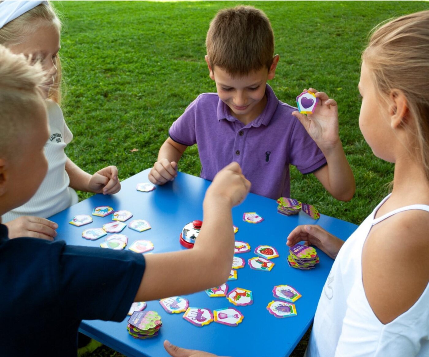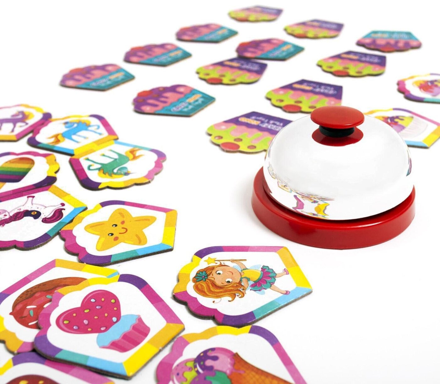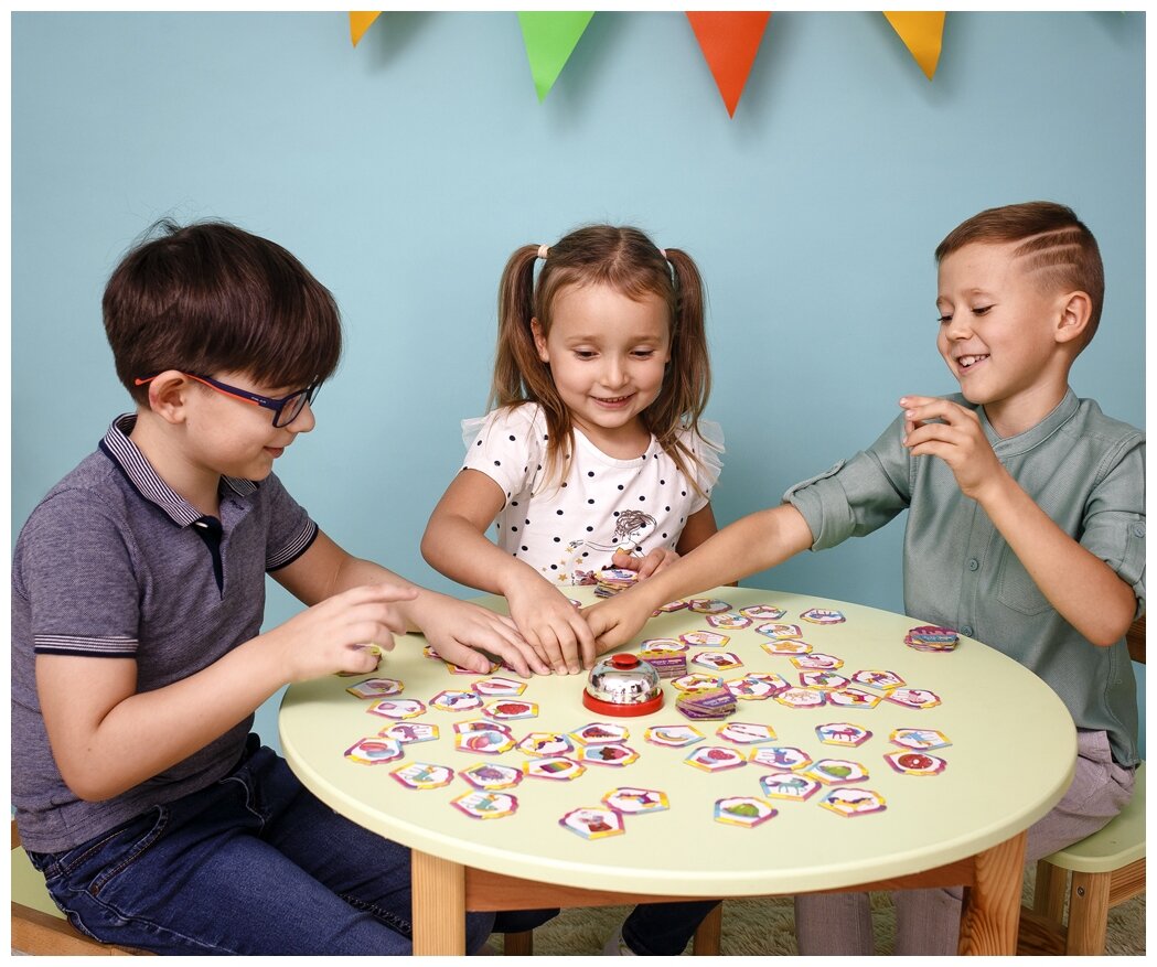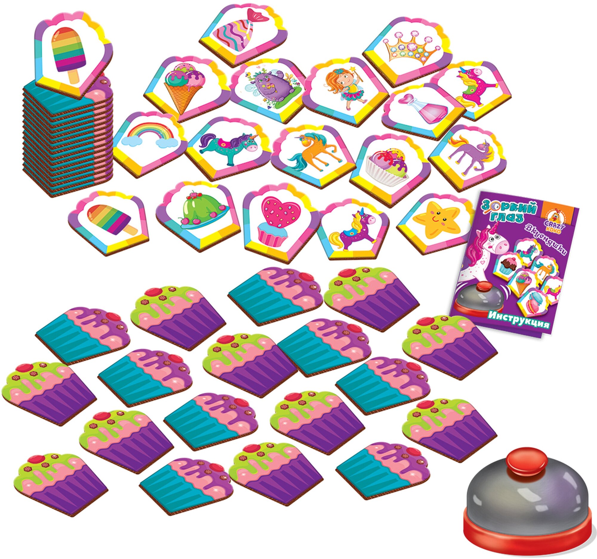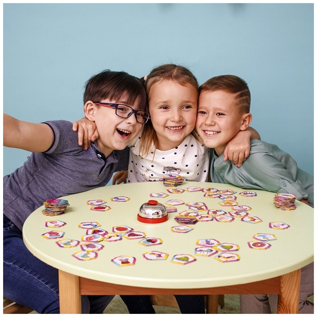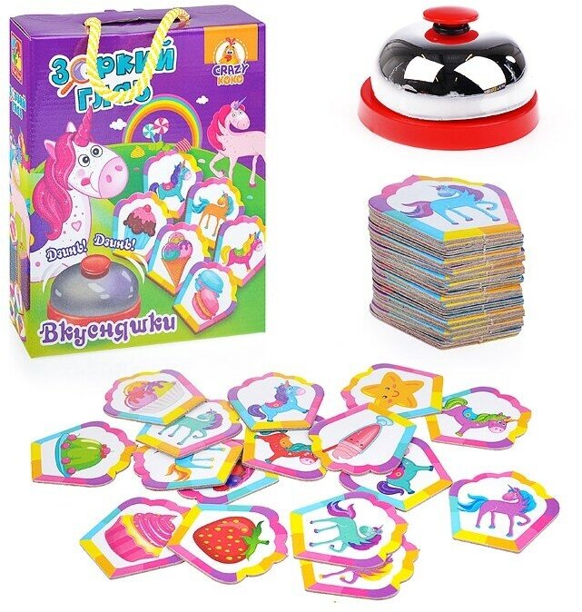 Ищите совпадения на карточках и быстрее всех жмите на звонок! "Дзинь!" - вот и одинаковые вкусняшки!