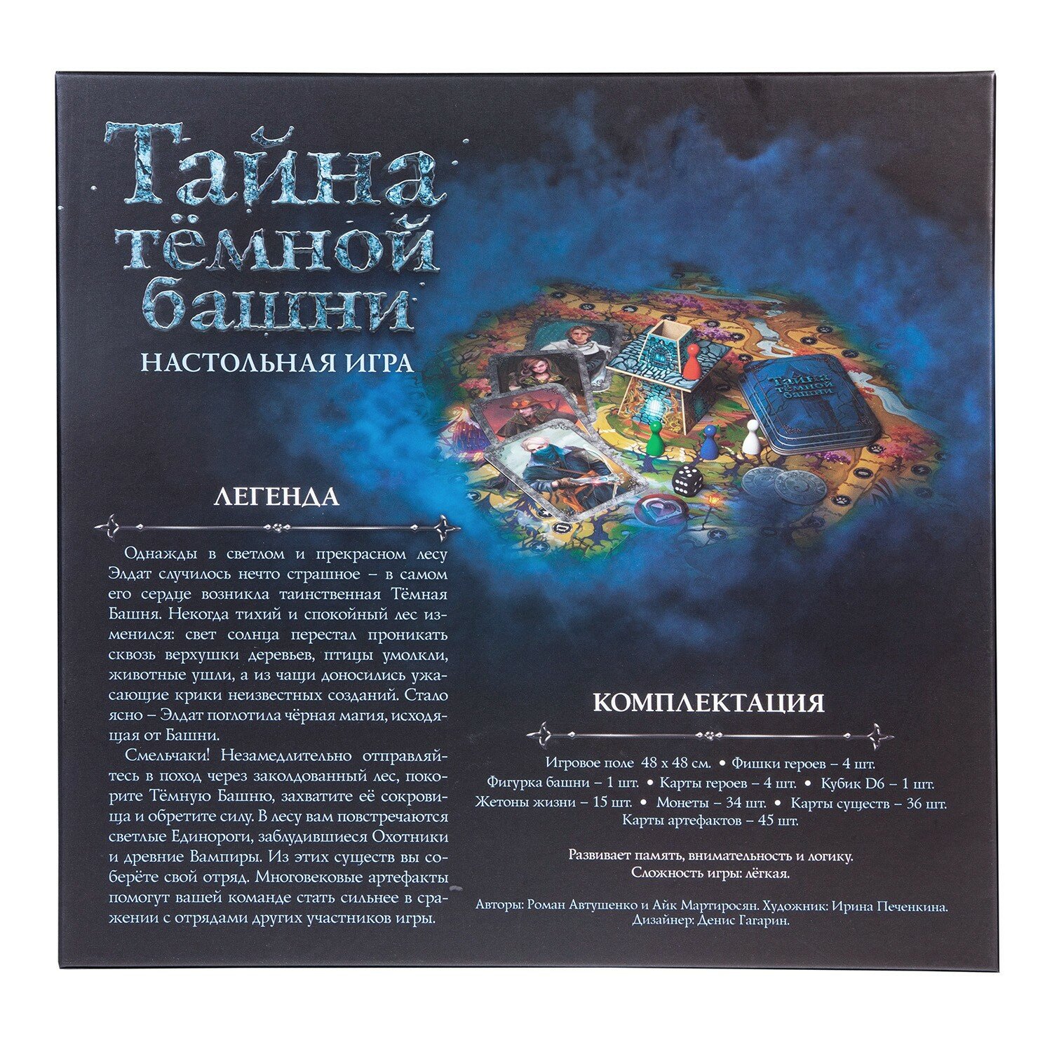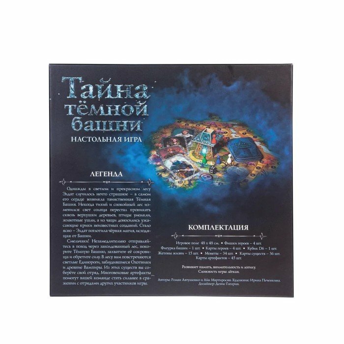 Настольная игра "Тайна тёмной башни" разработана специально для тех, кто хочет погрузиться в удивительный, немного мрачный, но такой манящий мир фэнтези. Действия разворачиваются в некогда прекрасном и светлом лесу Элдат, в который проникло колдовство, а из чащи стали доноситься звуки страшных созданий. В сердце леса возникла Тёмная Башня. Игрокам предстоит отправиться в поход через заколдованный лес, чтобы покорить Тёмную Башню, завладеть её богатствами и силой. В лесу им повстречаются светлые Единороги, заблудившиеся Охотники и древние вампиры. Из этих существ они соберут свой отряд, а ещё найдут многовековые артефакты, которые помогут существам стать сильнее. В финале игрокам предстоит сразиться друг с другом, используя собранные силы.