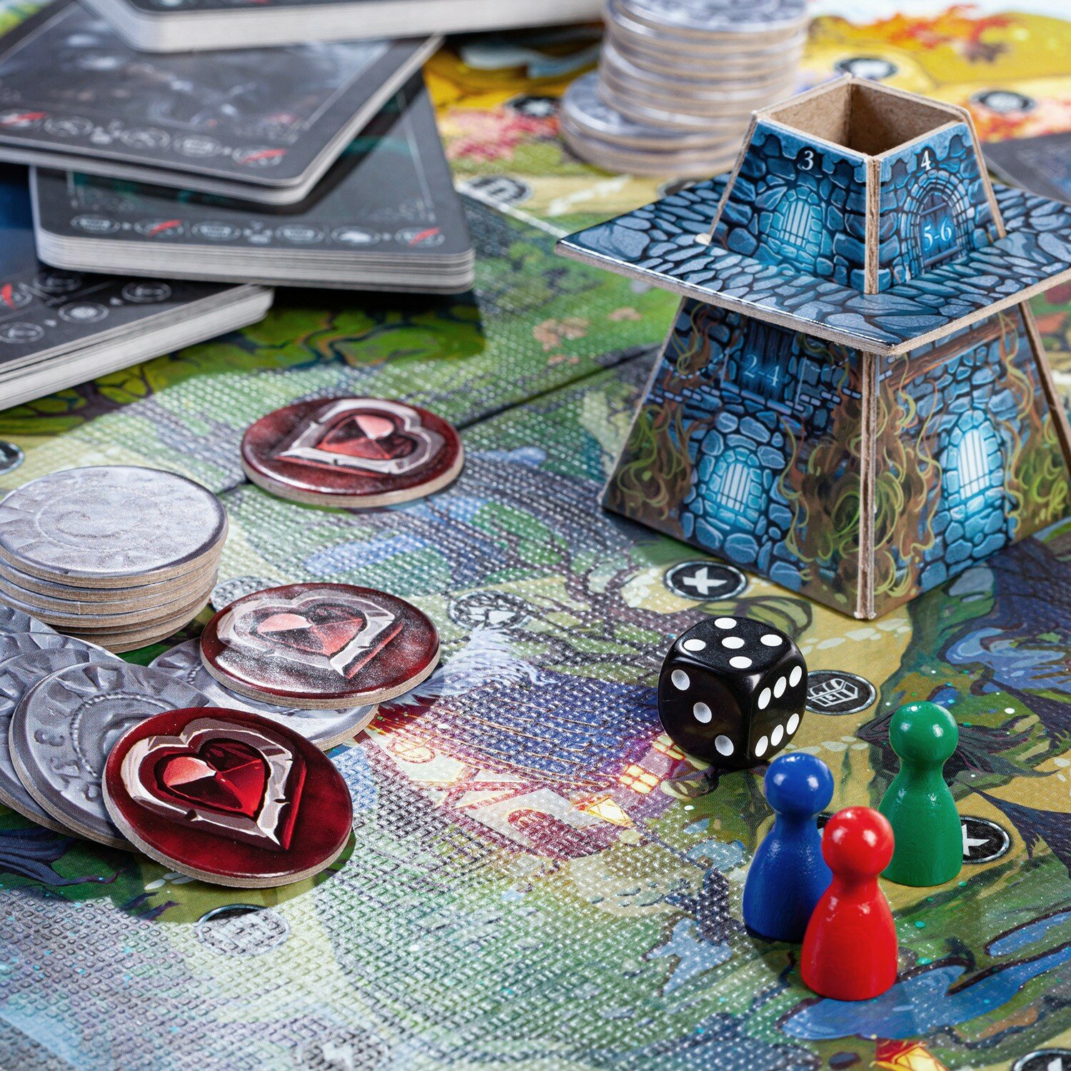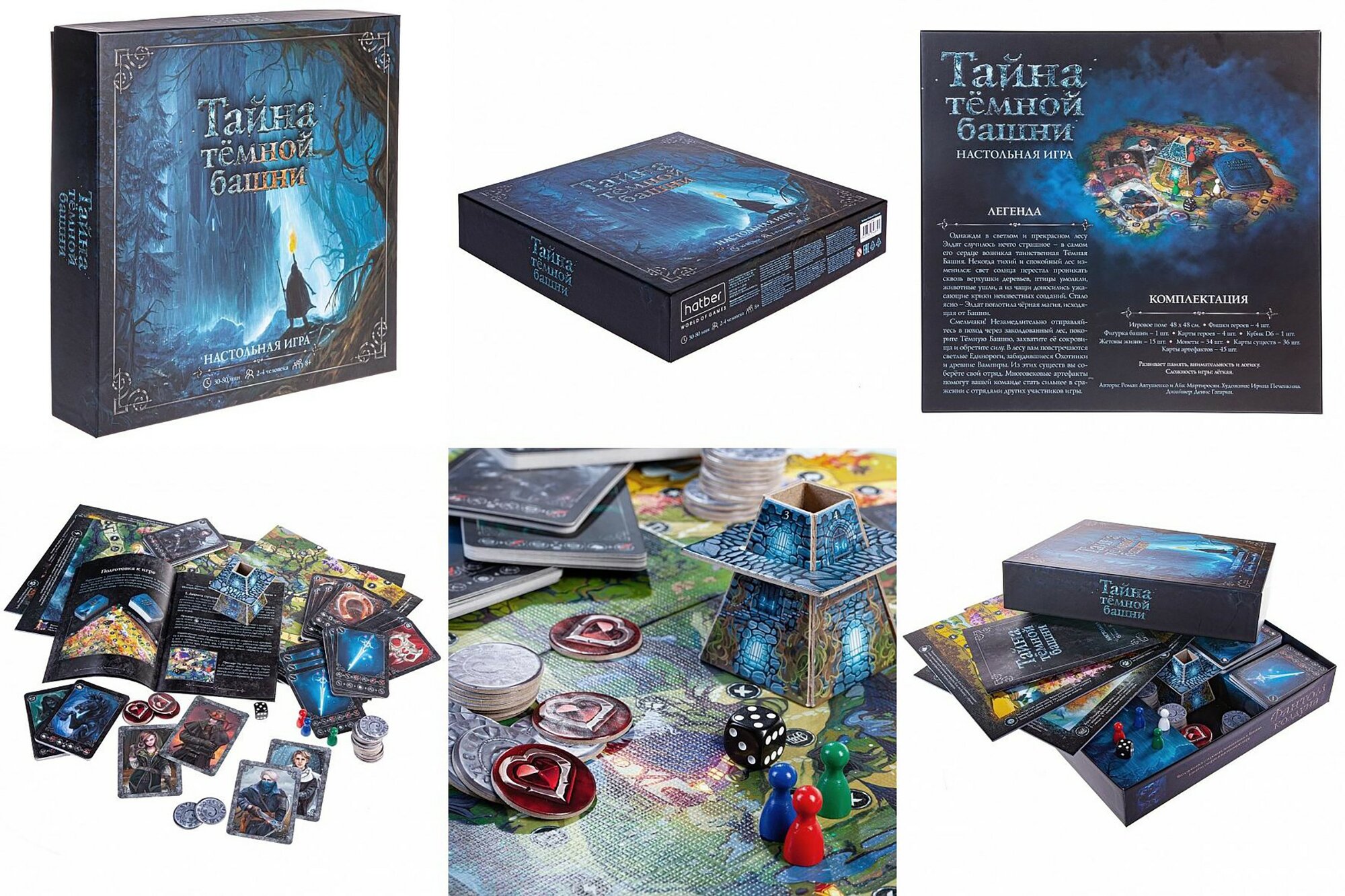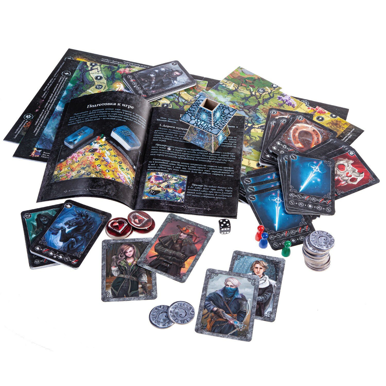 Комплектация | Игровое поле; фишки героев – 4 шт.; Фигурка башни; Карты героев – 4шт.; Кубик; Жетоны жизни; Монеты -34 шт.; Карты существ -36 шт.; Карты артефактов -45 шт.; Подробная инструкция |
