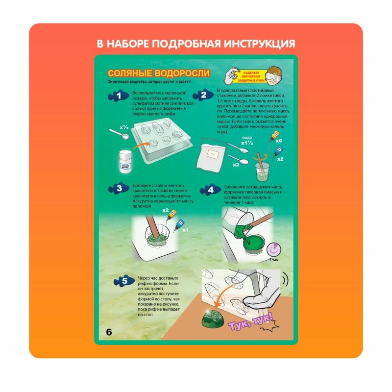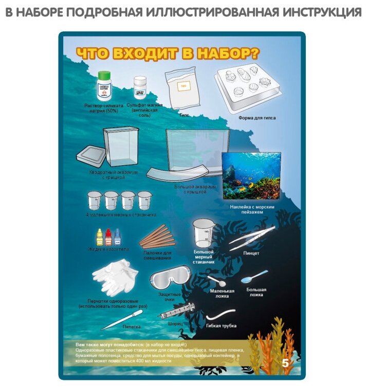раствор силиката натрия (50%), сульфат магния (английская соль), гипс, форма для гипса, квадратный аквариум с крышкой, большой аквариум с крышкой, наклейка с морским пейзажем, 4 маленьких мерных стаканчика, жидкие красители, палочки для смешивания, большой мерный стаканчик, пинцет, перчатки одноразовые (использовать только один раз), защитные очки, маленькая ложка, большая ложка, пипетка, шприц, гибкая трубка, инструкция.