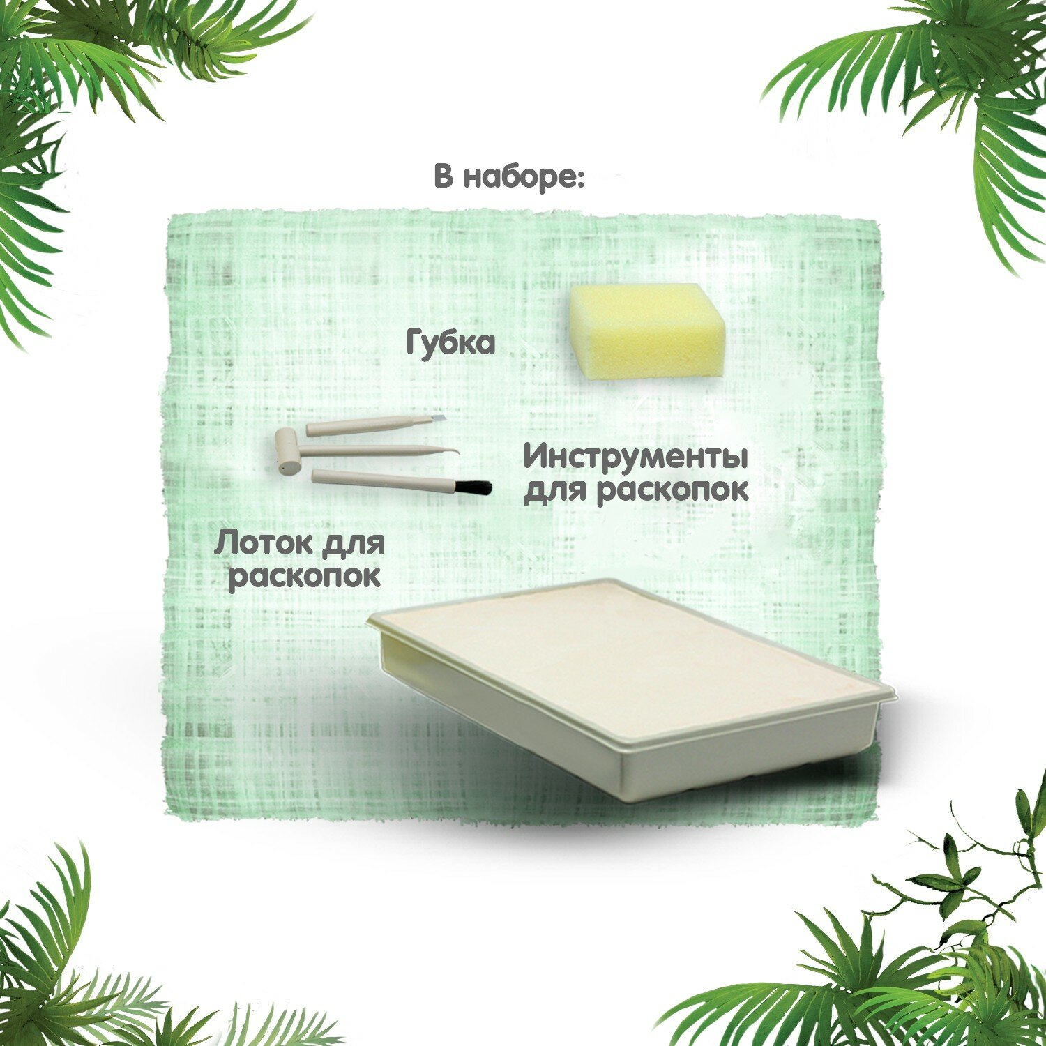 В наборе: блок для проведения раскопок, молоток, зубило, губка, кисточка, скелет динозавра, инструкция.