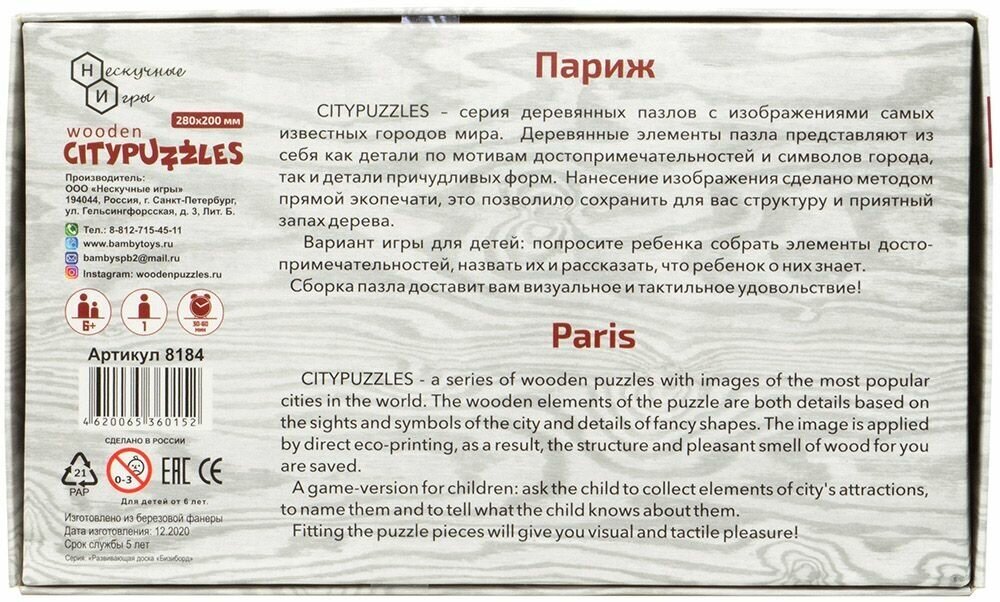 CITYPUZZLES - серия деревянных пазлов с изображениями самых известных городов мира. Деревянные элементы пазла представляют из себя как детали по мотивам достопримечательностей и символов города, так и детали причудливых форм. Нанесение изображения сделано методом прямой экопечати, это позволило сохранить для вас структуру и приятный запах дерева.