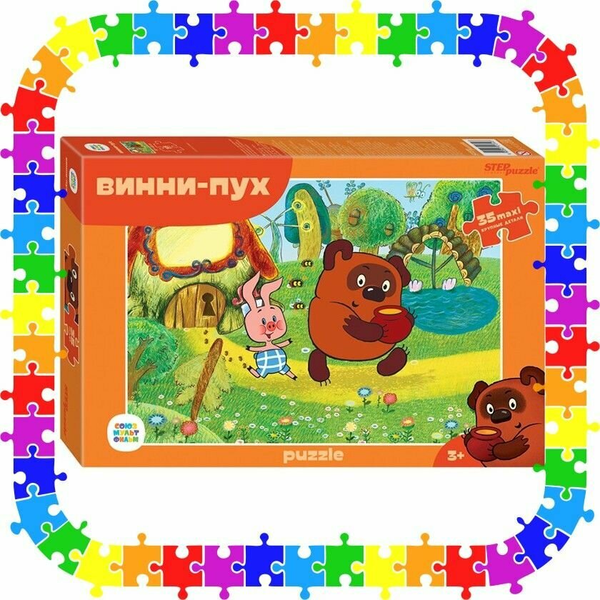 Пазл «Винни Пух» состоит из 35 крупных деталей. Он создан по мотивам культового советского мультфильма — так и хочется петь песенку «Куда идём мы с Пятачком» при взгляде на эту картинку.