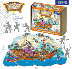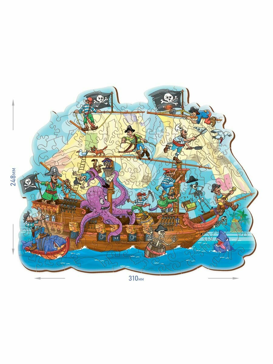 Фигурный пазл отличается от стандартного необычной формой деталей. Кроме того, часть деталей выполнены в форме предметов, связанных с тематикой картинки. В этом пазле есть даже детали в форме фигурок пиратов. Детали пазла выполнены из фанеры. Рисунок нанесен прямо на дерево с помощью специального принтера, он долговечен и не сотрется даже после многократных сборок. Такой пазл понравится и детям и взрослым, ведь сборка доставляет визуальное и тактильное удовольствие. Число деталей: 106. Размер собранного пазла: 31х24 см. Материал: фанера. Упаковка: картонная коробка 22,5х15,5х5 см.