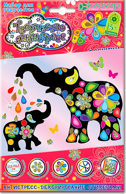 Картины-антистресс - это лучший способ отдохнуть и зарядиться энергией творчества! Ребёнок старше 5 лет легко наклеит на матированный полупрозрачный пластик силуэты большого и маленького слоников, заполнит их узорными радужными стикерами, а потом украсит картину блестящими голографическими элементами разнообразных форм.