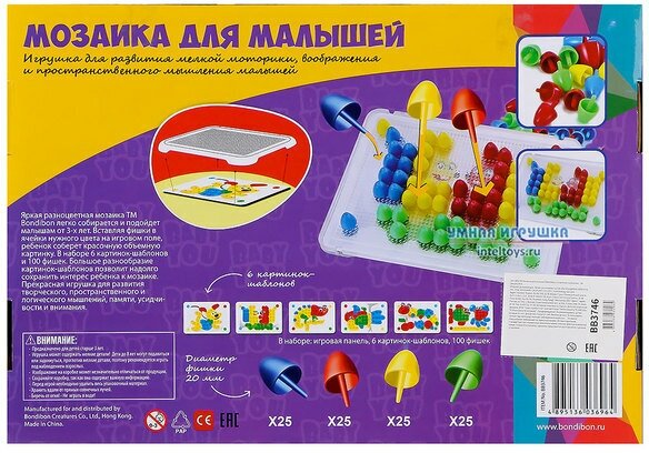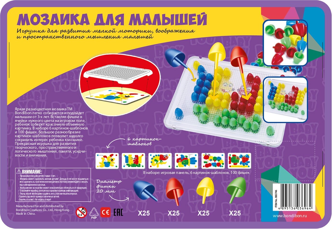 Яркая разноцветная мозаика ТМ Bondibon легко собирается и подойдет малышам от 3-х лет. Вставляя фишки в ячейки нужного цвета на игровом поле, ребенок соберет красочную объемную картинку. В наборе 6 картинок-шаблонов и 100 фишек. Большое разнообразие картинок-шаблонов позволит надолго сохранить интерес ребенка к мозаике. Прекрасная игрушка для развития творческого, пространственного и логического мышлений, памяти, усидчивости и внимания.