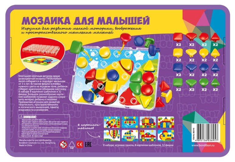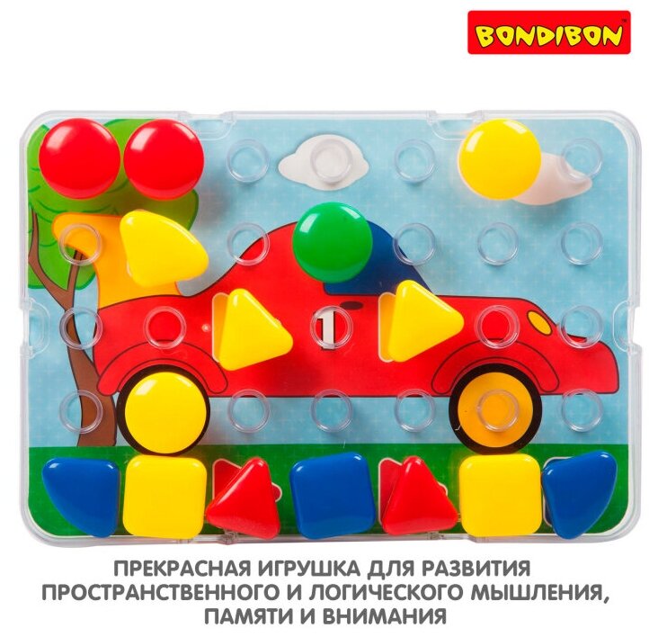 Благодаря крупным деталям яркая разноцветная мозаика ТМ Bondibon легко собирается и подойдет малышам от 3-х лет. Вставляя фишки в ячейки нужного цвета на игровом поле, ребенок соберет красочную объемную картинку.