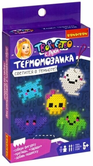Термомозаика - очень увлекательный и популярный вид детского творчества. В этом наборе от Бондибон есть все, чтобы сделать эффектные подвески-брелоки, которые к тому же будут светиться в темноте! Всё, что нужно для создания необычной игрушки - это собрать бусины на основе-планшете и прогладить через кальку утюгом. Горячая обработка расплавит пластик и склеит детали между собой. После остывания с фигуркой можно играть. После остывания фигурки ее можно зарядить под солнцем или искусственным источником освещения и проверить в темной комнате!