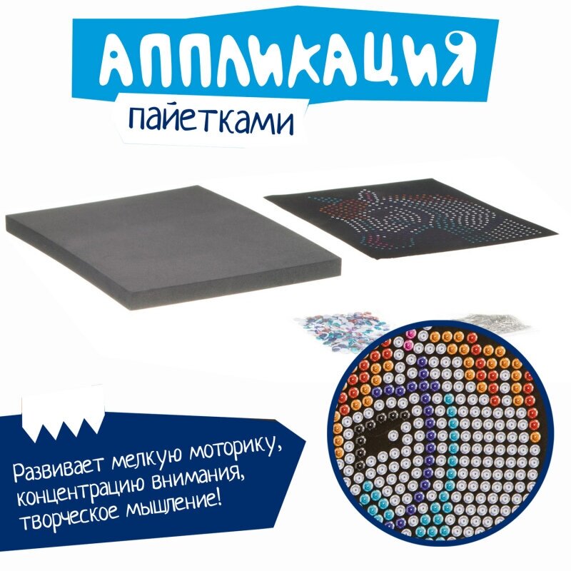 Аппликация из пайеток - увлекательный и завораживающе красивый вид творчества. В наборе - более 500 пайеток, бархатная основа из картона с нанесенной схемой, объемная основа картины из вспененного материала, гвоздики для крепления пайеток. Работа с этим набором поможет развить мелкую моторику, концентрацию внимания и творческое мышление. По итогу Вы получите очень красивую картину с изображением головы лошади, а также море хорошего настроения и творческого вдохновения!
