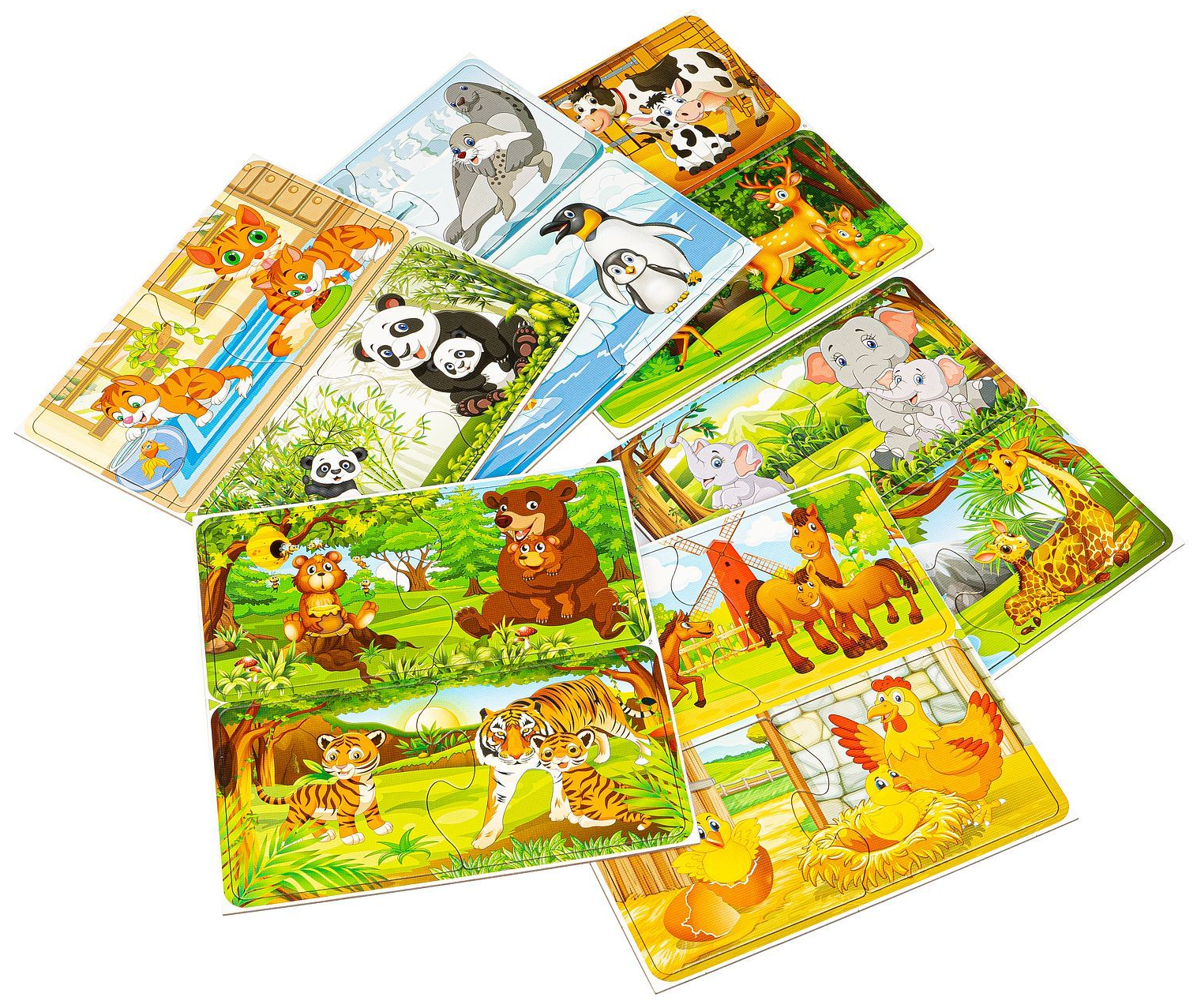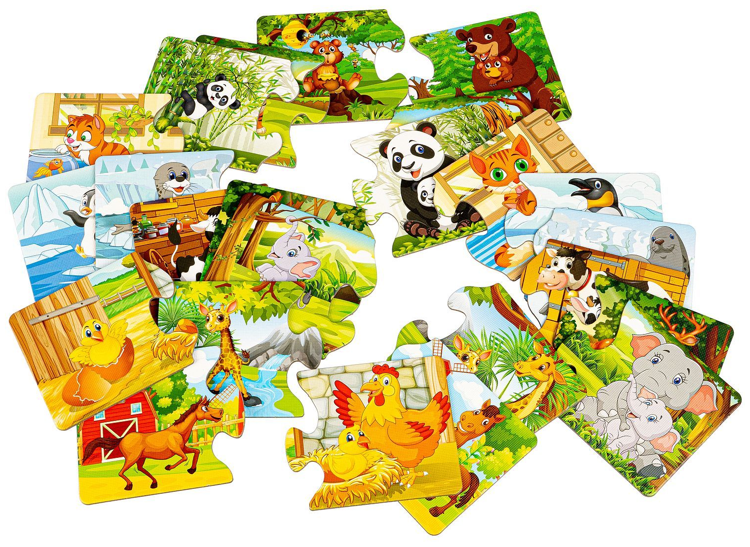 На 12 пазлах изображены малыши животных, на других 12 пазлах - малыши вместе с мамами.