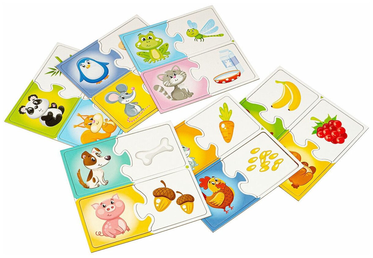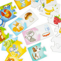 На 12 пазлах изображены дикие и домашние животные, на других 12 пазлах - их любимые лакомства. На обороте каждого пазла прописано название животного и его лакомство.