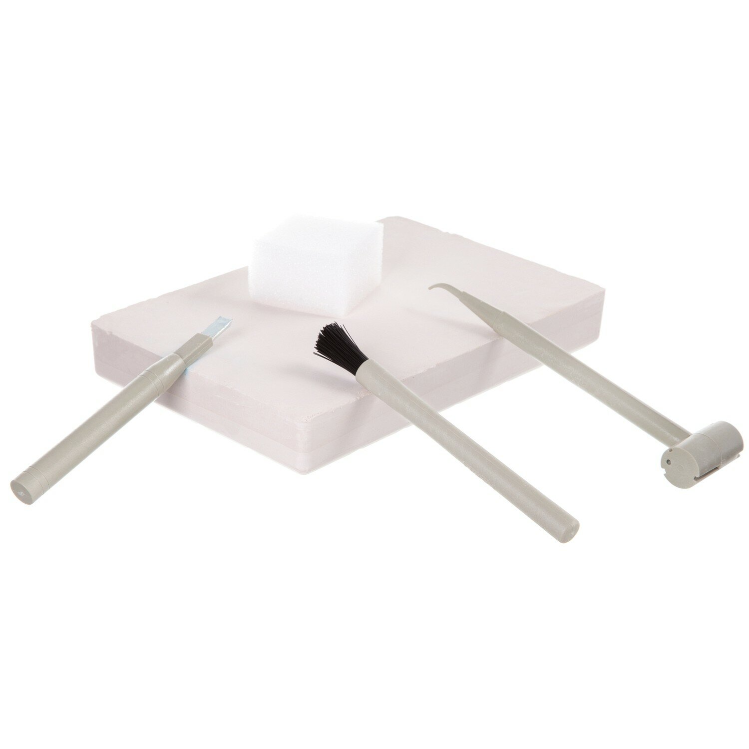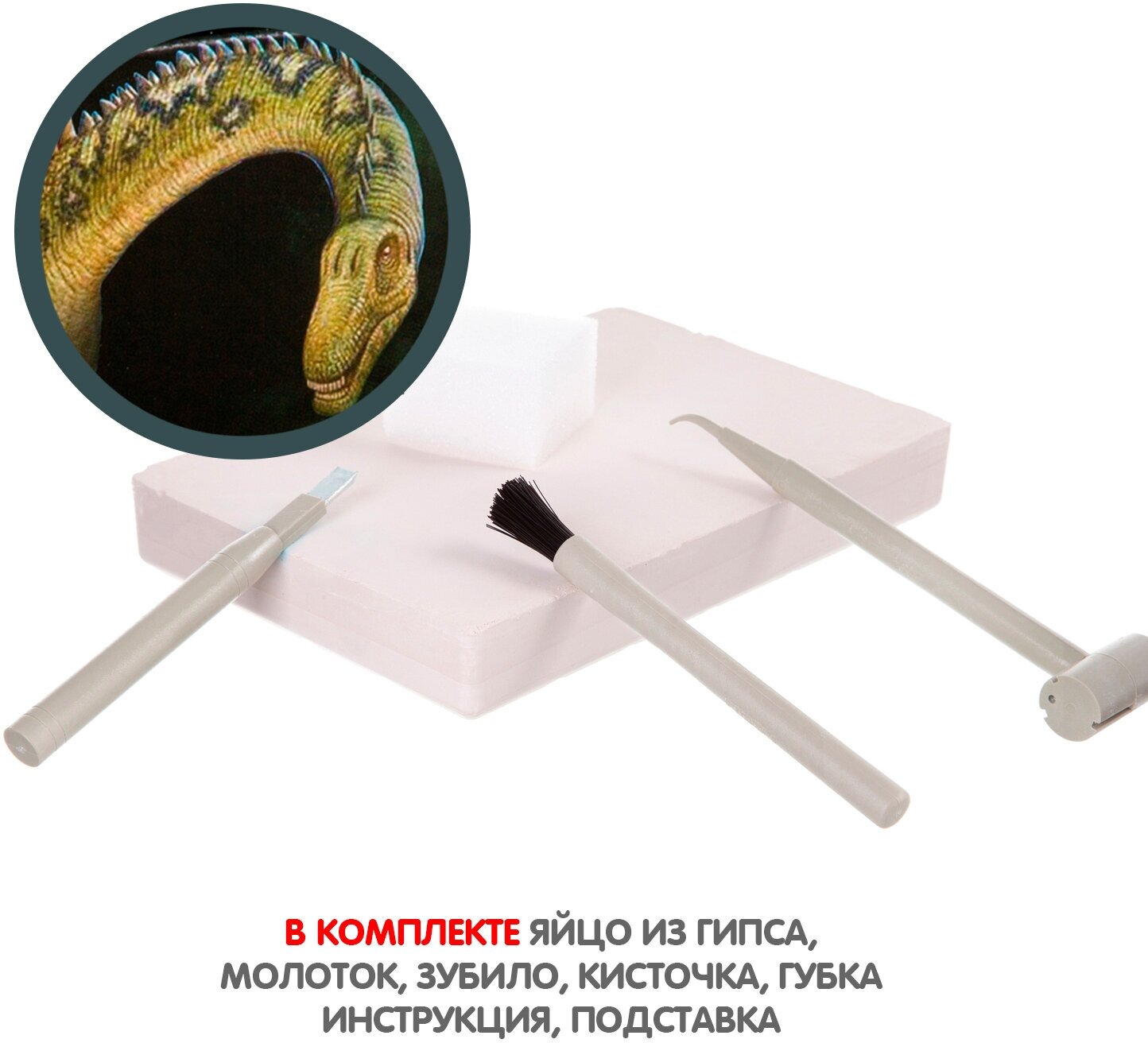 В наборе: блок для проведения раскопок, молоток, зубило, губка, кисточка, скелет динозавра, инструкция.