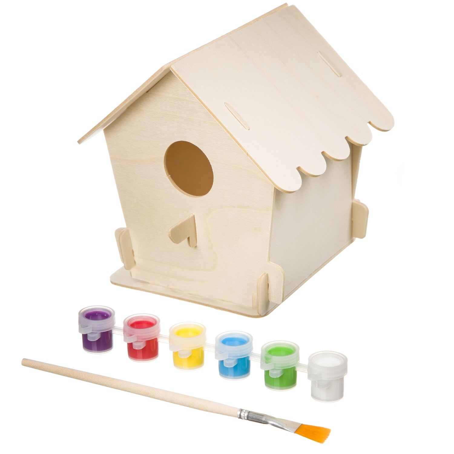 Состав набора: детали из фанеры, кисть, краски, схема сборки.