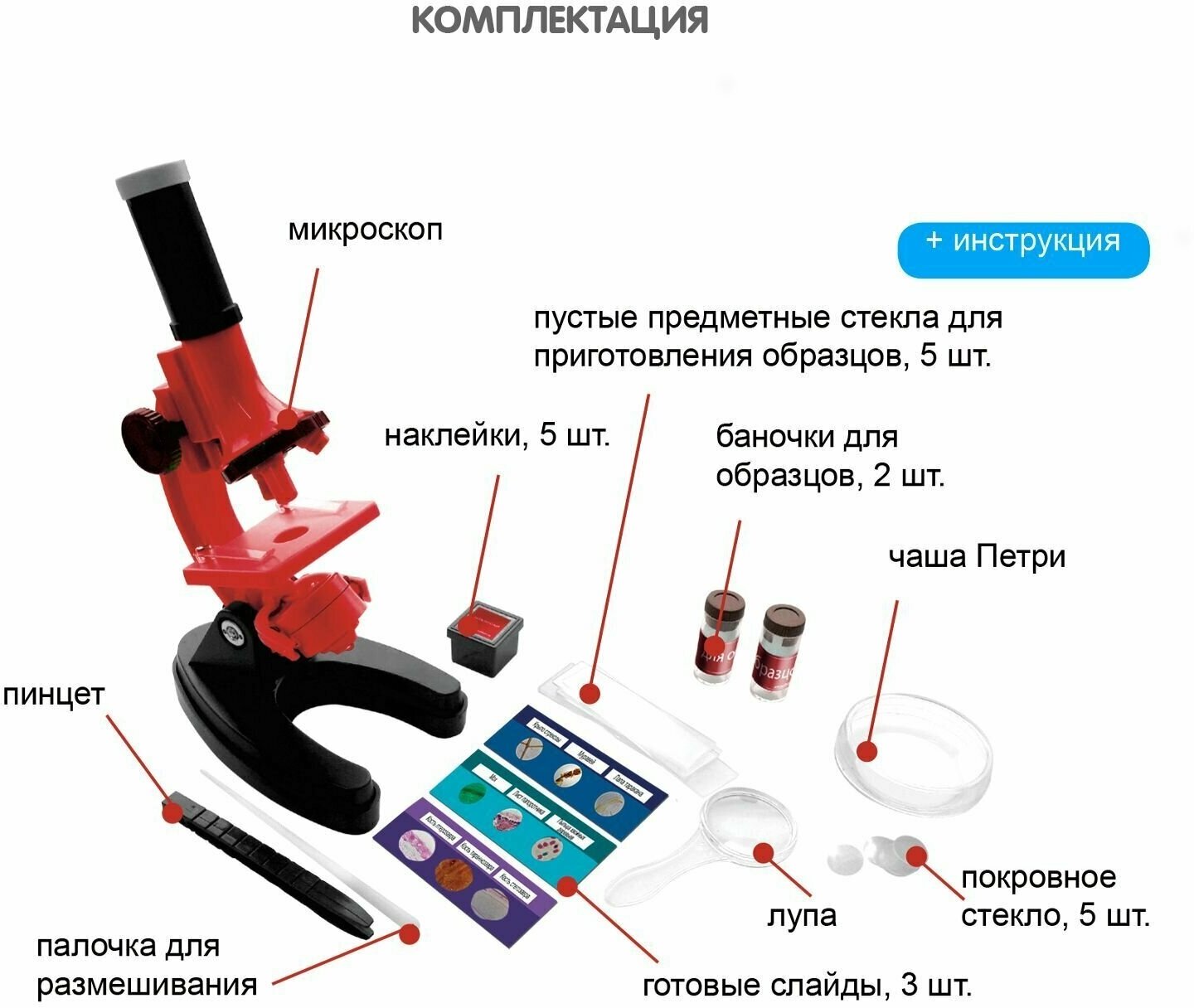 В наборе: микроскоп, 5 пустых стекол для приготовления образцов, чаша Петри, лупа, пинцет, палочка для размешивания, 2 баночки для образцов, 3 слайда с образцами, покровные стекла 5 шт., наклейки, инструкция.