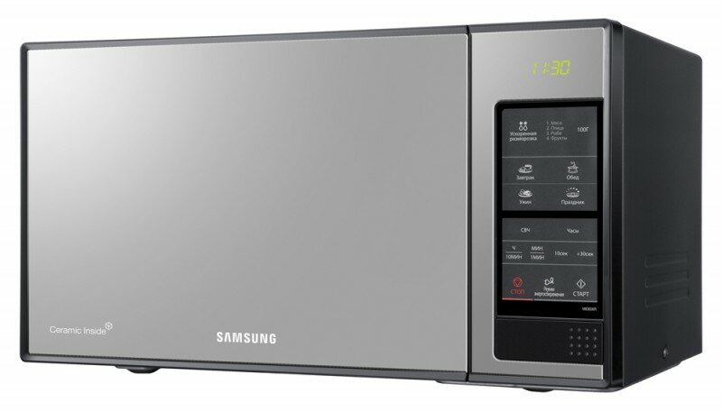 Микроволновая печь Samsung - это не только многофункциональное, но и очень стильное устройство. Сенсорная панель управления эффектно сочетается с зеркальным оформлением дверцы. Внутреннее покрытие выполнено из особой биокерамической эмали. Этот материал не только помогает легко справляться с грязью и жиром, но и борется с вредными бактериями. Высокая прочность покрытия позволяет ему быть устойчивым к повреждениям и, как следствие, долгое время оставаться в первозданном виде.