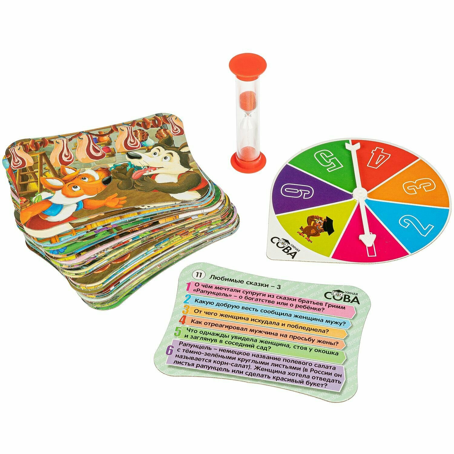 В комплект входят: 32 двусторонние карточки из твердого картона, рулетка, песочные часы.