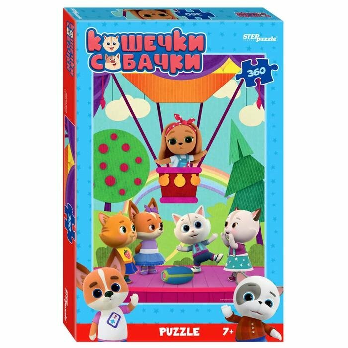 Этот пазл состоит из 360 деталей. На картинке мы видим одну из сцен мультфильма «Кошечки и собачки»: на этот раз наши друзья отправились в путешествие на воздушном шаре.