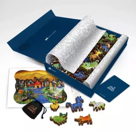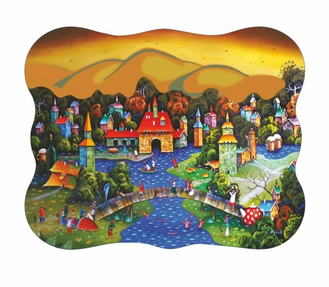В деталях пазла - искренняя душевность и повестовательность элементов и сцен: неспешно едет веселый тракторист, тетушка доит корову, парень дарит цветы любимой, коза жует цветочек, пес, догоняющий кота, домашние животные в своем досуге…
