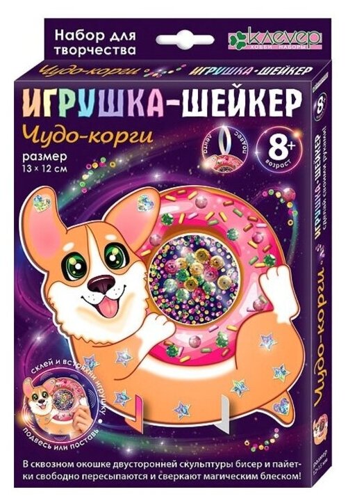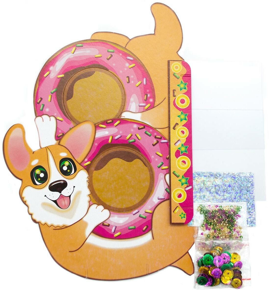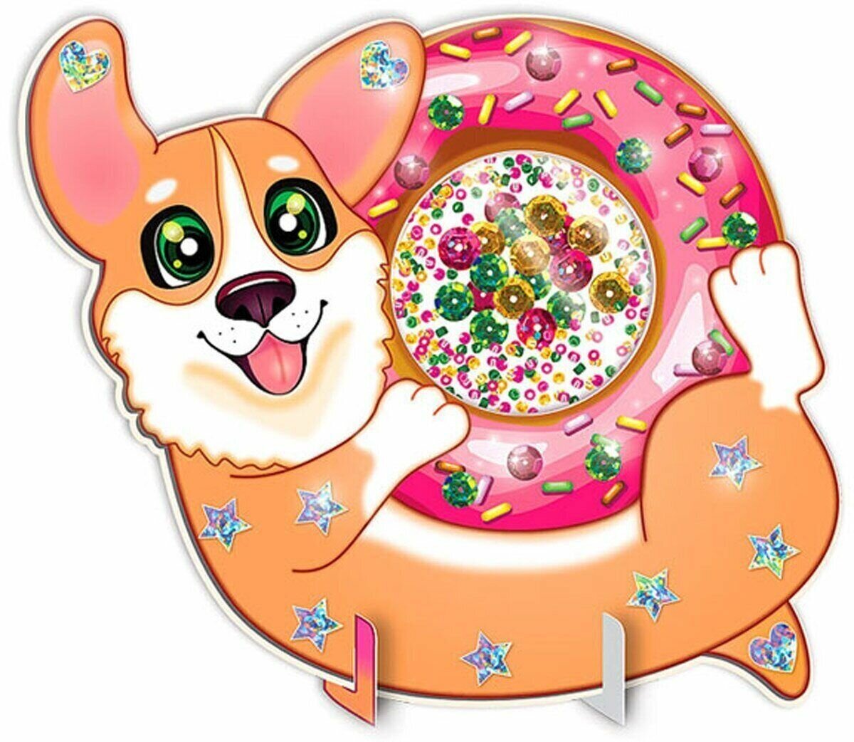 Весёлый пёсик-корги с аппетитным пончиком в цветной сахарной глазури, декорированный голографическими стикерами и блестящими пайетками, - это сверкающее чудо, сделанное своими руками!