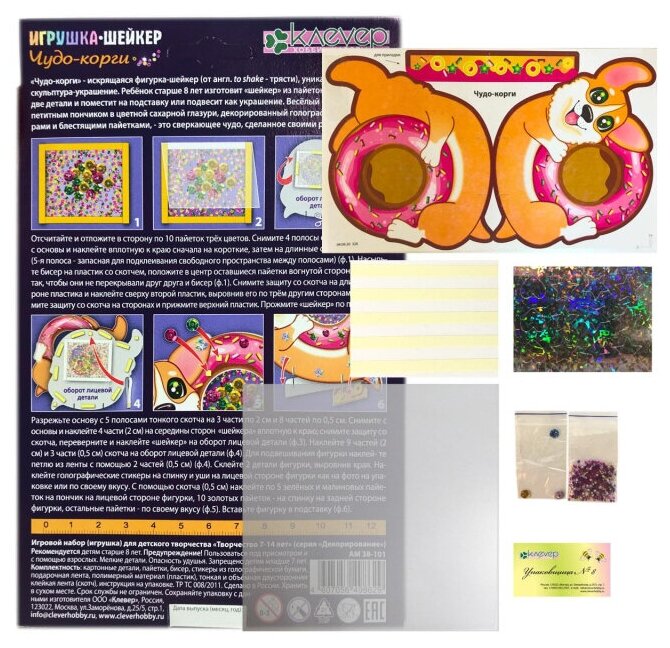 Комплектация: Готовые детали из картона и пластика, пайетки, бисер, бумажная лента, двусторонняя клейкая объёмная и тонкая лента (скотч)