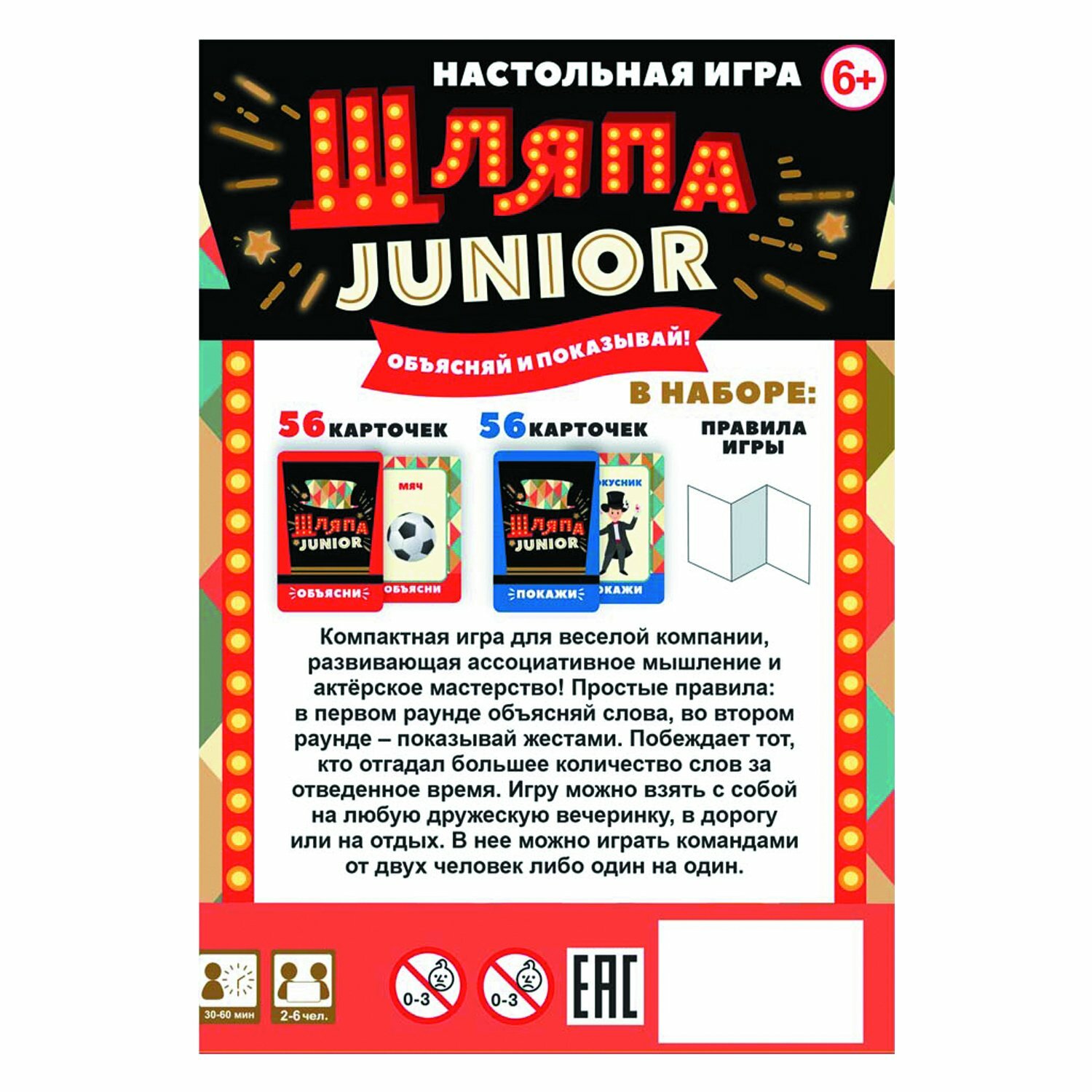 Компактная играя для веселой компании, развивающая ассоциативное мышление и актёрское мастерство! Простые правила: в первом раунде объясняй слова, во втором раунде - показывай жестами, в третьем раунде показывай все слова вперемешку в полной тишине. Побеждает тот, кто отгадал большее количество слов за отведенное время. Игру можно взять с собой на любую дружескую вечеринку, в дорогу или на отдых. В нее можно играть командами от 2 человек, либо один на один.