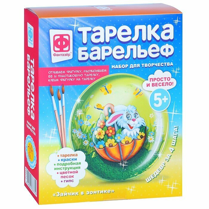 В наборе: пластиковая тарелка, форма для заливки, гипс, клей, кварцевый песок, наждачная бумага, акриловый лак, краски, кисть, инструкция.