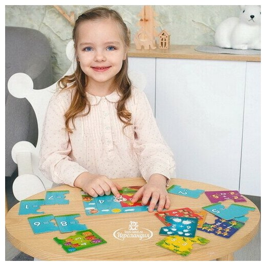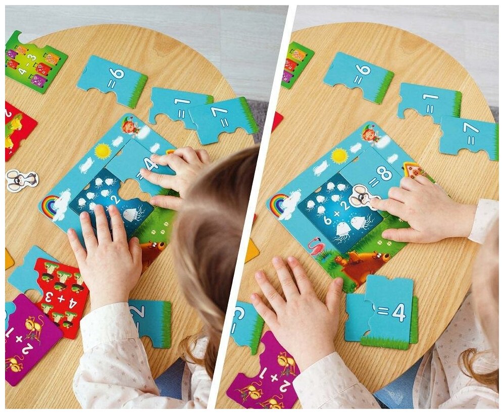 Разложите все детали перед ребенком. С одной стороны положите картинки, а с другой - цифры. Пусть малыш внимательно их рассмотрит, а затем подберет пару к каждому рисунку. Для этого нужно решить примеры на каждой картинке. Когда изображение будет составлено, проверьте его с помощью специальной фигурки. Если мышь помещается внутрь пазла, значит все подсчитано правильно.