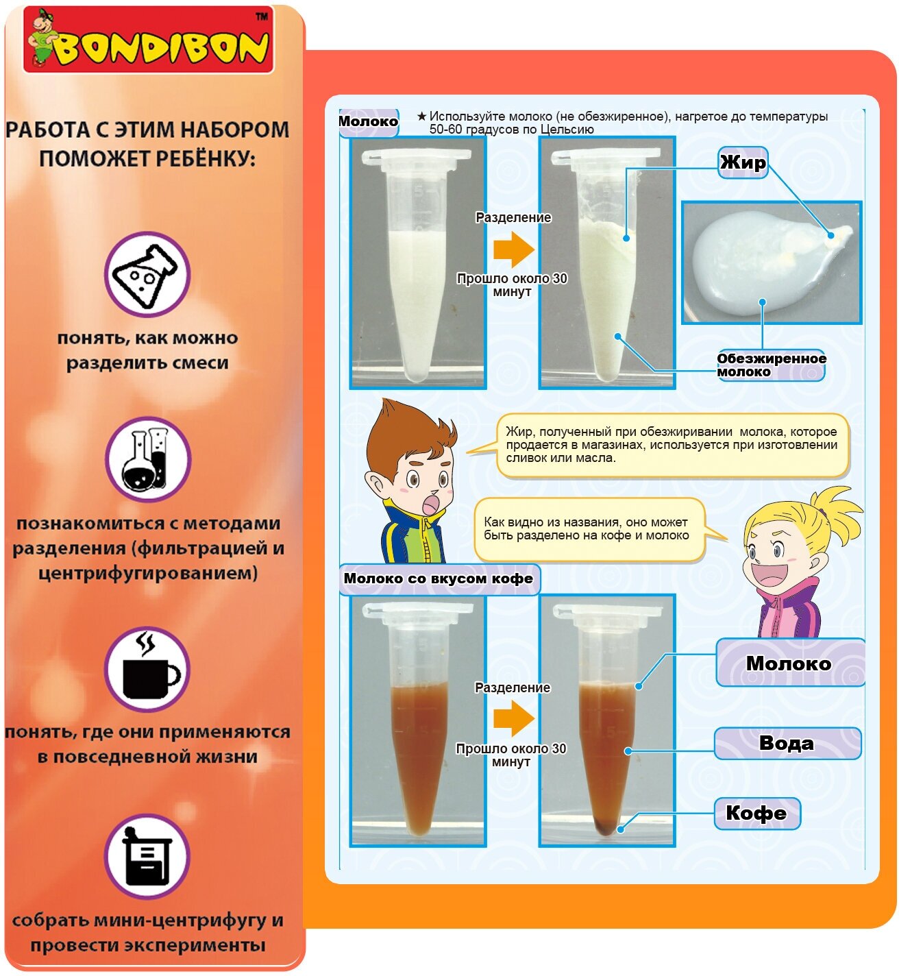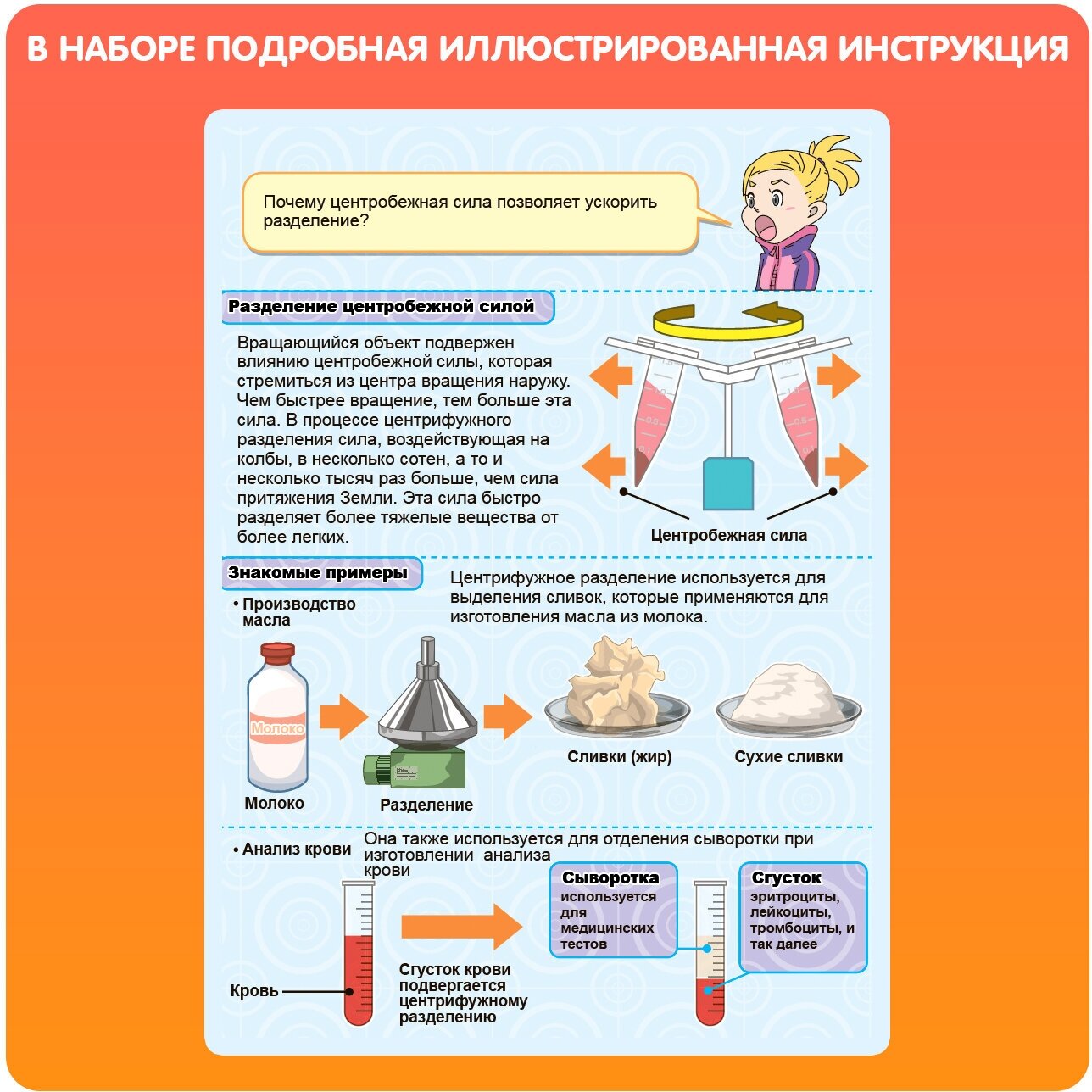 Дети часто интересуются, из чего состоят продукты, которые мы едим каждый день? Соусы, сливки, сок, заправка для салата – все это может стать объектом веселого и увлекательного исследования с использованием мини-центрифуги. Всего за несколько минут однородная масса разделится на отдельные ингредиенты, и ребенок сможет легко определить, что салатная заправка – это смесь растительного масла и уксуса, а в апельсиновом соке содержатся мелкие частички фруктов. А заодно он научится делать из молока сливки и узнает, какие вещества растворяются в воде, а какие – нет. В состав набора входят корпус, крышка и ротор центрифуги, а также 6 колб, красочная инструкция.