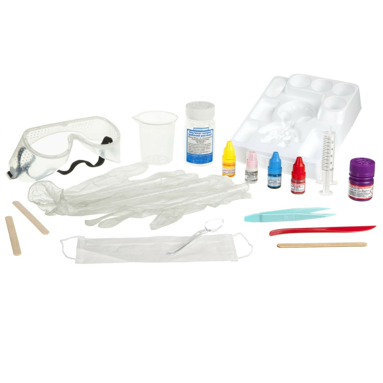 В состав набора входят 4 гр альгината натрия, большая емкость, 10 г хлорида кальция, 5 г перламутра, красный, синий и желтый красители, рабочая станция, 3 пипетки, 3 палочки для смешивания, ложечка, пинцет, шприц, нож, стакан, очки, маска, пара перчаток, инструкция.