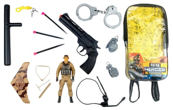 | Состав набора | Аэроплан (4 детали); Граната - 2 шт; Дубинка; Карабин с ключами; Наручники; Наушники с микрофоном; Пистолет; Рюкзак; Стрелы га присоске - 3 шт; Фигурка - солдат |