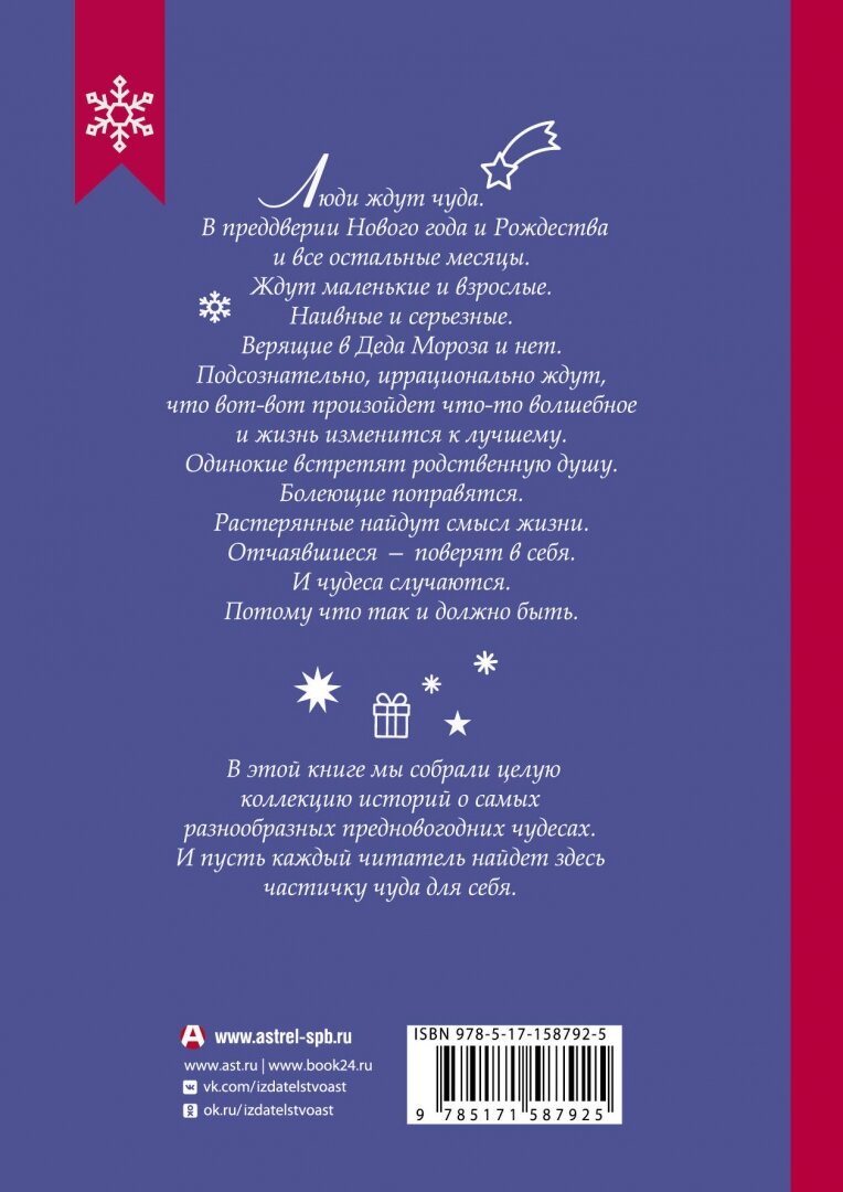 Люди ждут чуда. В преддверии Нового года и Рождества и все остальные месяцы. Ждут маленькие и взрослые. Наивные и серьезные. Верящие в Деда Мороза и нет.Подсознательно, иррационально ждут, что вот-вот произойдет что-то волшебное и жизнь изменится к лучшему.Одинокие встретят родственную душу. Болеющие поправятся. Растерянные найдут смысл жизни. Отчаявшиеся — поверят в себя.И чудеса случаются. Потому что так и должно быть.В этой книге мы собрали целую коллекцию историй о самых разнообразных предновогодних чудесах. И пусть каждый читатель найдет здесь частичку чуда для себя.