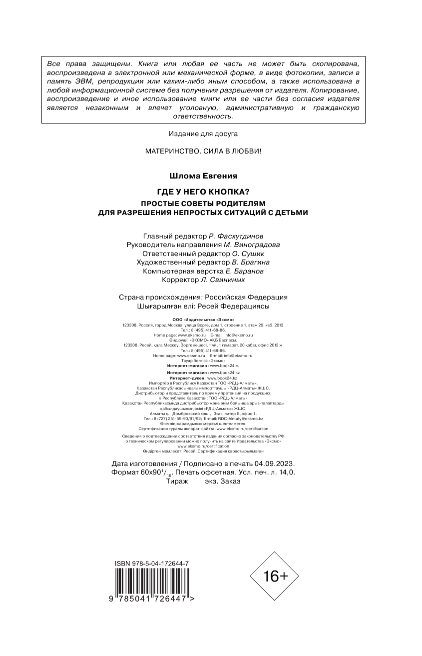 На сегодняшний день товар «Книга: Где у него кнопка? Простые советы родителям для разрешения непростых ситуаций с детьми (Шлома Евгения Александровна); ООО "Издательство "Эксмо", 2023» можно купить с кешбеком в 4 магазинах: book24, Буквоед, Читай-город, Яндекс.Маркет