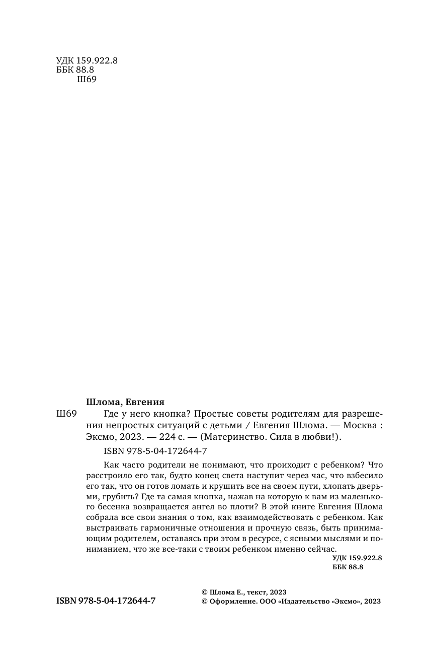 Где у него кнопка? Простые советы родителям для разрешения непростых ситуаций с детьми (Шлома Евгения Александровна); ООО "Издательство "Эксмо", 2023