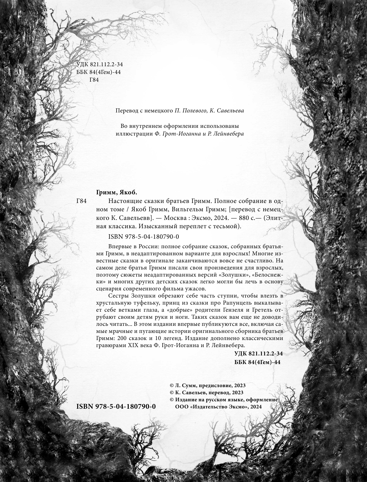 Сестры Золушки обрезают себе часть ступни, чтобы влезть в хрустальную туфельку, принц из сказки про Рапунцель выкалывает себе ветками глаза, а «добрые» родители Гензеля и Гретель отрубают своим детям руки и ноги. Таких сказок вам еще не доводилось читать В этом издании впервые публикуются все, включая самые мрачные и пугающие истории оригинального сборника братьев Гримм: 200 сказок и 10 легенд. Издание дополнено классическими гравюрами XIX века Ф. Грот-Иоганна и Р. Лейнвебера.