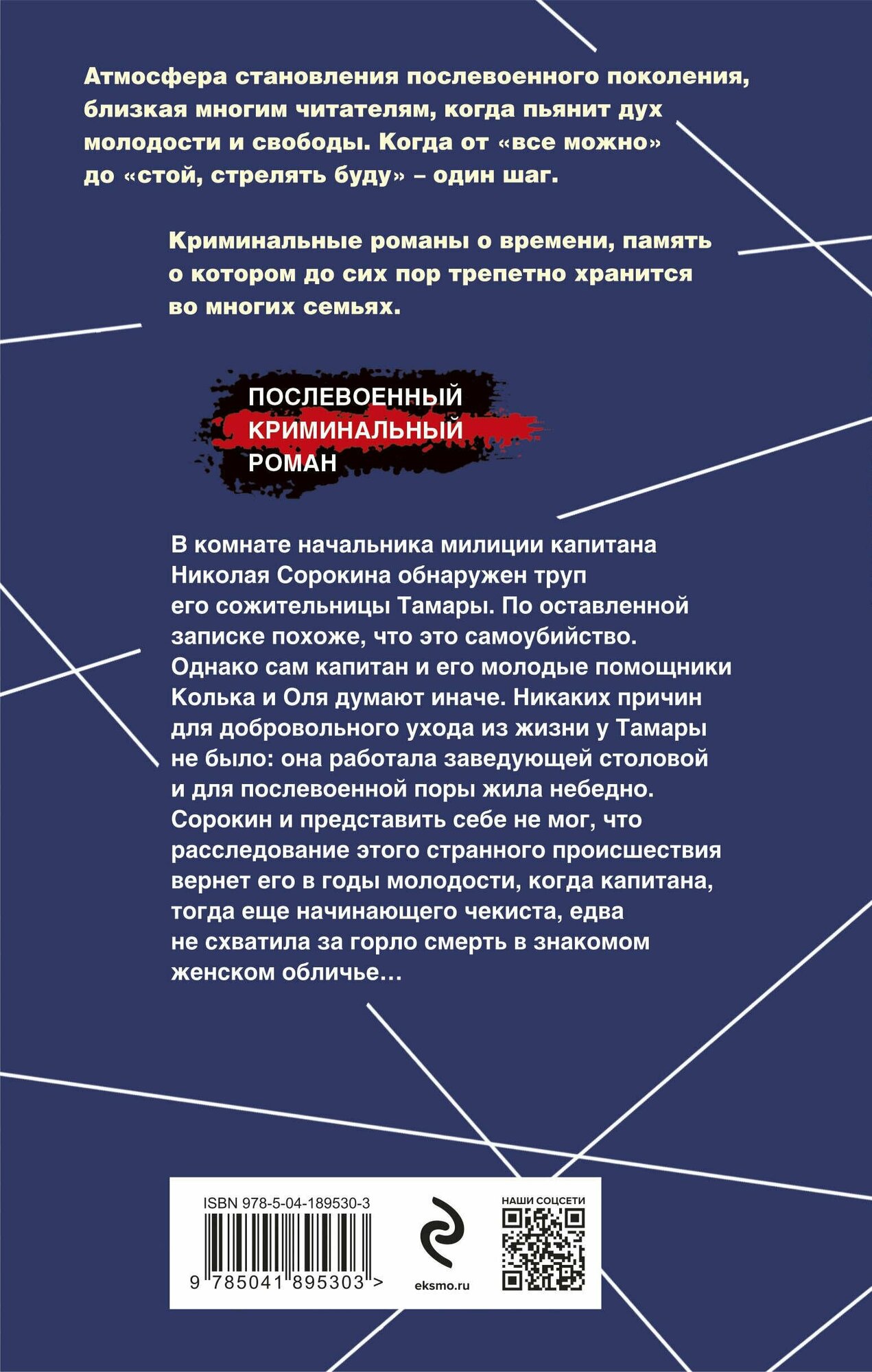 В комнате начальника милиции капитана Николая Сорокина обнаружен труп его сожительницы Тамары. По оставленной записке похоже, что это самоубийство. Однако сам капитан и его молодые помощники Колька и Оля думают иначе. Никаких причин для добровольного ухода из жизни у Тамары не было: она работала заведующей столовой и для послевоенной поры жила небедно. Сорокин и представить себе не мог, что расследование этого странного происшествия вернет его в годы молодости, когда капитана, тогда еще начинающего чекиста, едва не схватила за горло смерть в знакомом женском обличье…
