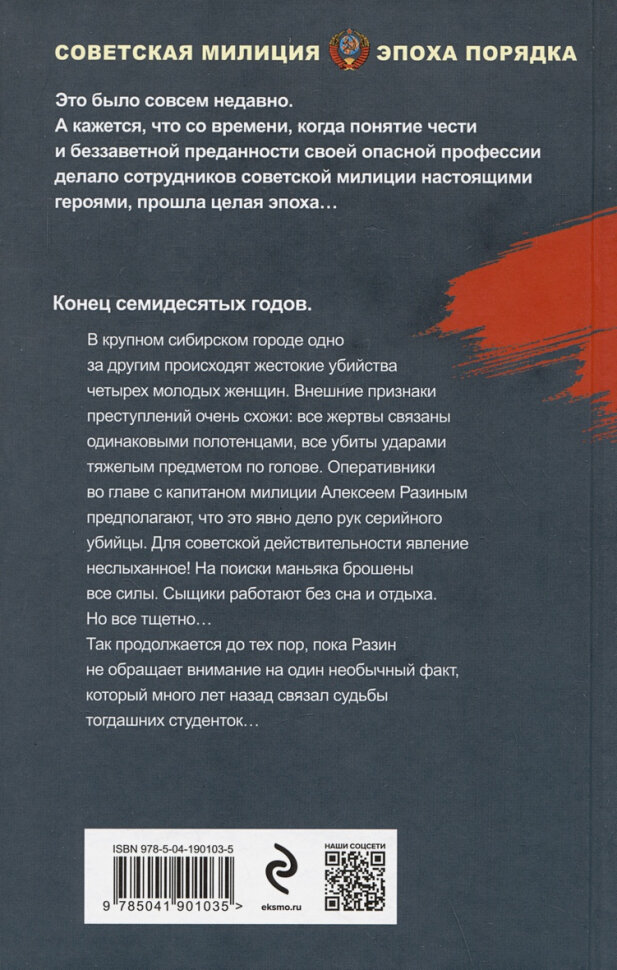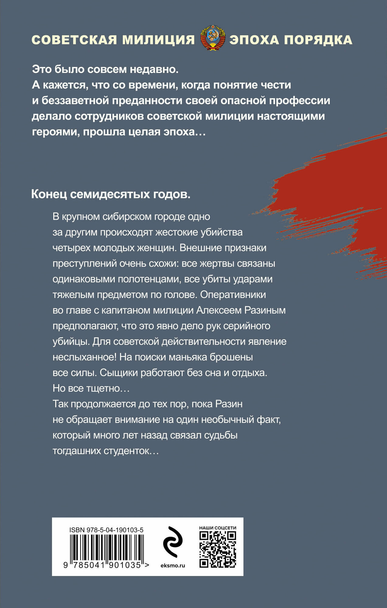 Конец семидесятых годов. В крупном сибирском городе одно за другим происходят жестокие убийства четырех молодых женщин. Внешние признаки преступлений очень схожи: все жертвы связаны одинаковыми полотенцами, все убиты ударами тяжелым предметом по голове. Оперативники во главе с капитаном милиции Алексеем Разиным предполагают, что это явно дело рук серийного убийцы. Для советской действительности явление неслыханное! На поиски маньяка брошены все силы. Сыщики работают без сна и отдыха. Но все тщетно… Так продолжается до тех пор, пока Разин не обращает внимание на один необычный факт, который много лет назад связал судьбы тогдашних студенток…