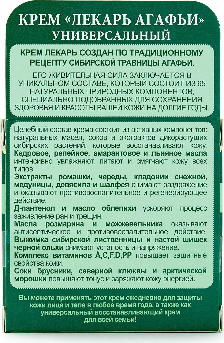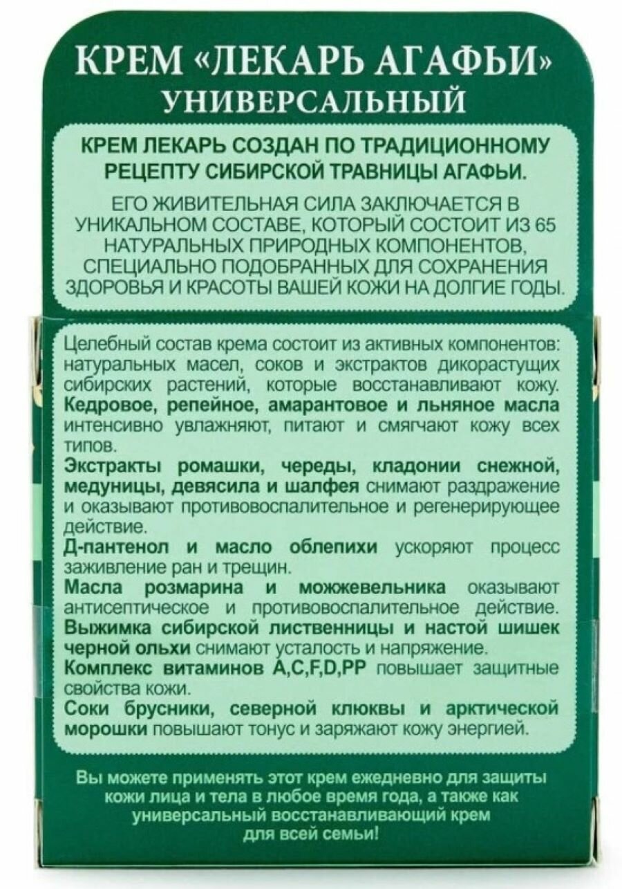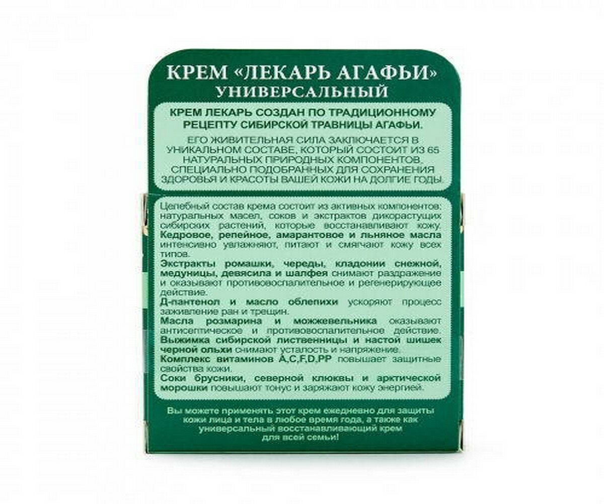 Крем-лекарь создан по традиционному рецепту сибирской травницы Агафьи.