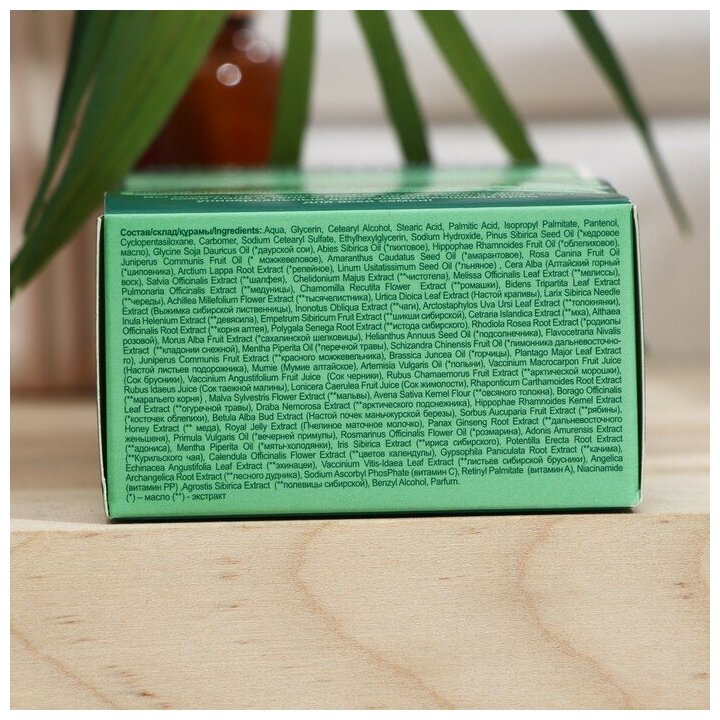 | Состав | Aqua, Glycerin, Cetearyl Alcohol, Stearic Acid, Palmitic Acid, Isopropyl Palmitate, Pantenol, Cyclopentasiloxane, Carbomer, Sodium Cetearyl Sulfate, Ethylhexylglycerin, Sodium Hydroxide, Pinus Sibirica Seed Oil, Glycine Soja Dauricus Oil, Abies Sibirica Oil, Hippophae Rhamnoides Fruit Oil, Juniperus Communis Fruit Oil, Amaranthus Caudatus Seed Oil, Rosa Canina Fruit Oil, Arctium Lappa Root Extract, Linum Usitatissimum Seed Oil, Cera Alba, Salvia Officinalis Extract, Chelidonium Majus Extract, Melissa Officinalis Leaf Extract, Helianthus Annuus Seed Oil, Cetraria Nivalis Extract, Mentha Piperita Oil, Schizandra Chinensis Fruit Oil, Juniperus Communis Fruit Extract, Brassica Juncea Oil, Plantago Major Leaf Extract, Mumie, Artemisia Vulgaris Oil, Vaccinium Macrocarpon Fruit Juice, Vaccinium Angustifolium Fruit Juice, Rubus Chamaemorus Fruit Extract, Rubus Idaeus Juice, Lonicera Caerulea Fruit Juice, Rhaponticum Carthamoides Root Extract, Malva Sylvestris Flower Extract, Avena Sativa Kernel Flour, Borago Officinalis Leaf Extract, Draba Nemorosa Extract, Hippophae Rhamnoides Kernel Extract, Betula Alba Bud Extract, Sorbus Sibirica Extract, Honey Extract, Royal Jelly Extract, Panax Ginseng Root Extract, Primula Vulgaris Oil, R Benzyl Alcohol, Parfum |