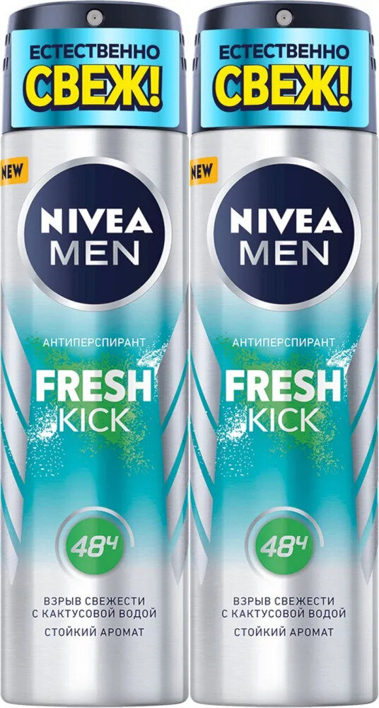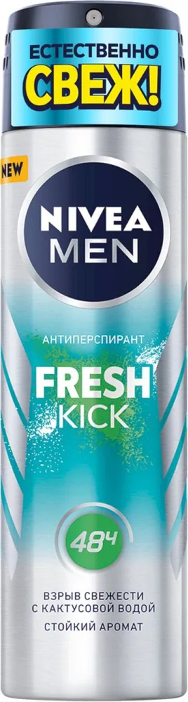 Ощутите взрыв свежести вместе с новым антиперспирантом NIVEA MEN Fresh Kick с кактусовой водой в стильном дизайне в формате спрея. Антиперспирант подарит вам чувство бодрящей свежести, стойкий аромат и надежную защиту от пота и запаха на протяжении 48 часов. Новый NIVEA MEN Fresh Kick обеспечивает не только свежесть, а также уверенность и комфорт на весь день. Необычным компонентом нового антиперспиранта является кактусовая вода, которая вместе с другими ингредиентами дает ощущение свежести от NIVEA MEN Fresh Kick как после душа в жаркий день! Защитите себя от пота, забудьте о неприятном запахе и раздражении, вместо этого почувствуйте чистоту после каждого применения. Будь естественно свеж вместе с NIVEA MEN Fresh Kick!