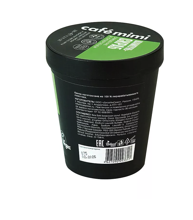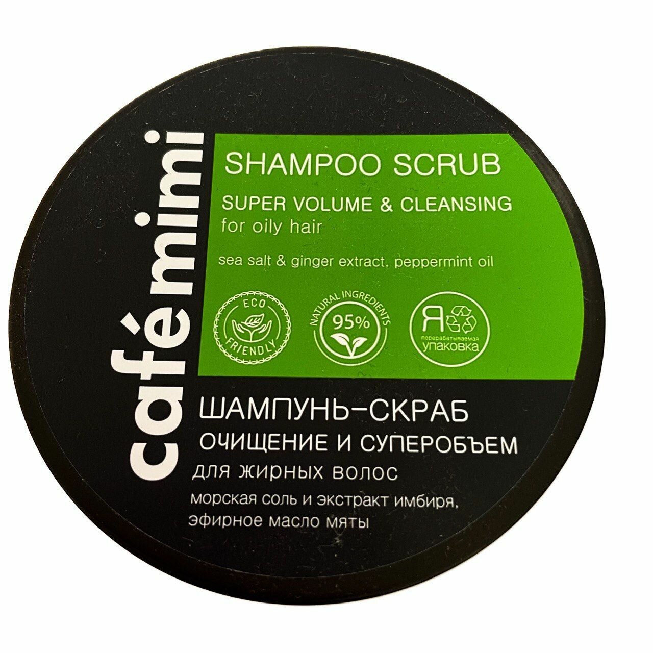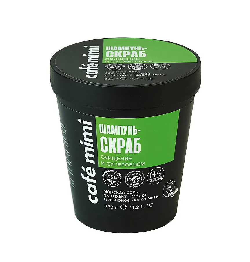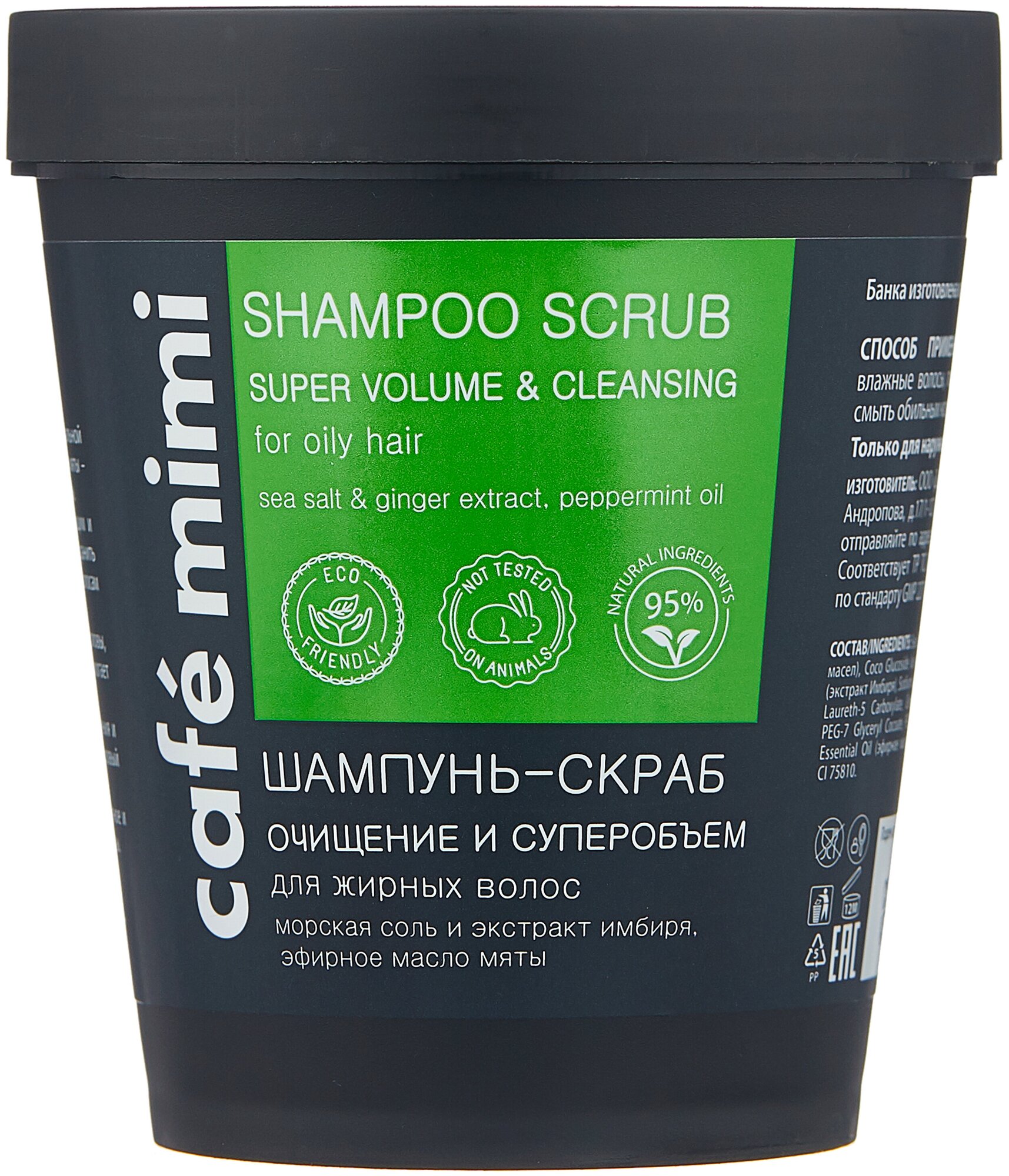 Шампунь-скраб Cafe mimi Очищение и Суперобъем содержит более 50% натуральной морской соли, экстракт имбиря и эфирное масло мяты - настоящий детокс-уход за волосами и кожей головы.