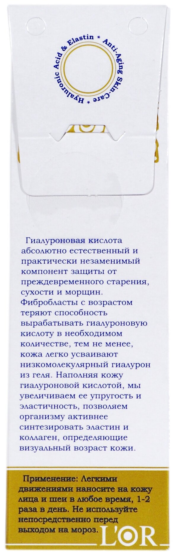 Увлажняющий противовозрастной. Гиалуроновая кислота абсолютно естественный и практически незаменимый компонент защиты от преждевременного старения, сухости и морщин. Фибробласты с возрастом теряют способность вырабатывать гиалуроновую кислоту в необходимом количестве, тем не менее, кожа легко усваивает низкомолекулярный гиалурон из геля. Наполняя кожу гиалуроновой кислотой, мы увеличиваем ее упругость и эластичность, позволяем организму активнее синтезировать эластин и коллаген, определяющие визуальный возраст кожи.